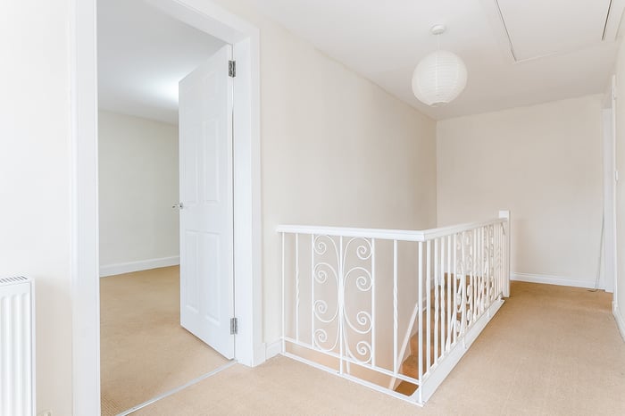 Upstairs, the landing leads to two further well-proportioned bedrooms. Bedroom two benefits from a large built-in wardrobe with mirrored doors, while bedroom three also includes built-in storage.