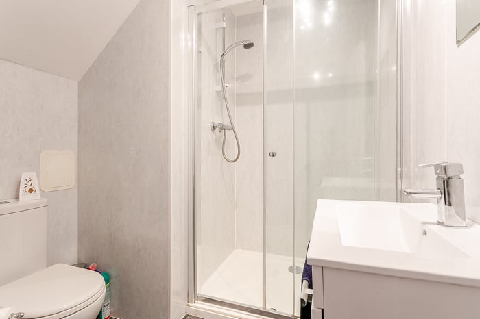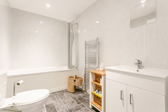 A modern family bathroom completes the upper level, featuring a three-piece suite with a shower over the bath, panelled splash walls, and a ladder-style radiator.