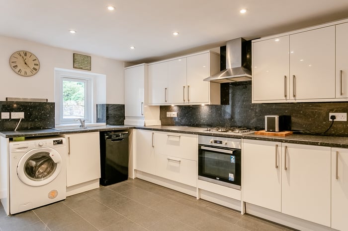 A few steps lead to a particularly generous kitchen/dining area, ideal for family living and entertaining. The kitchen is fitted with contemporary units, stone-effect worktops, an integrated oven and hob, and freestanding appliances including a dishwasher, a washing machine, and an American-style fridge/freezer.