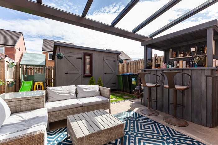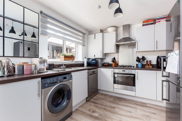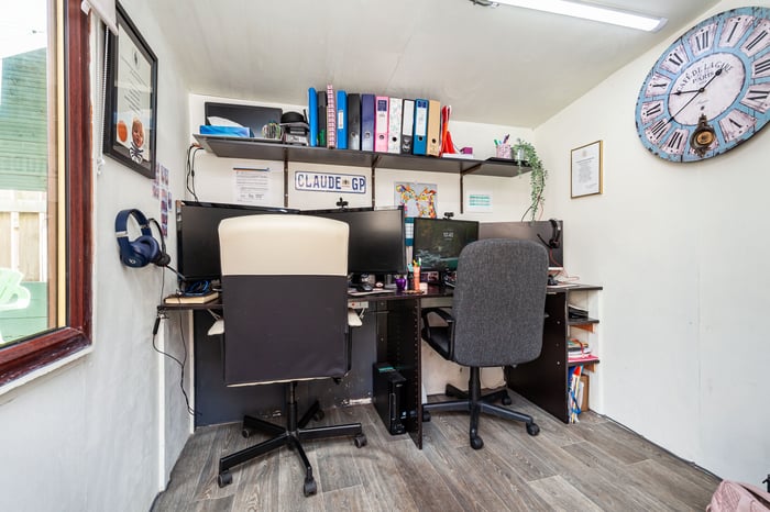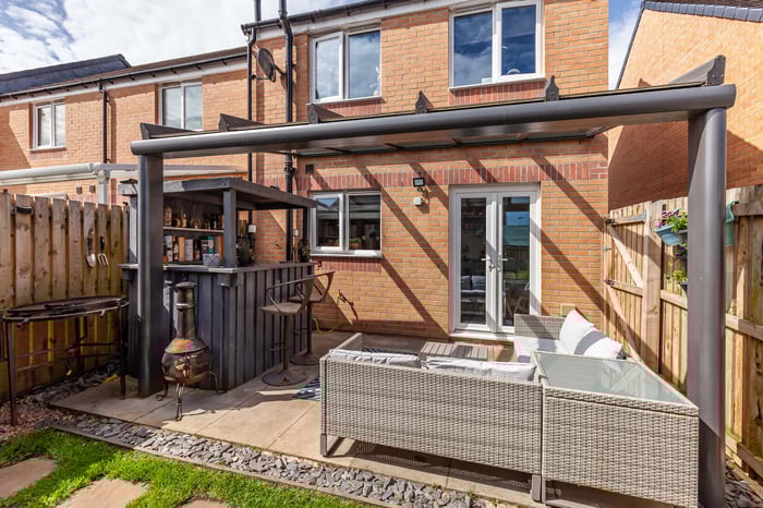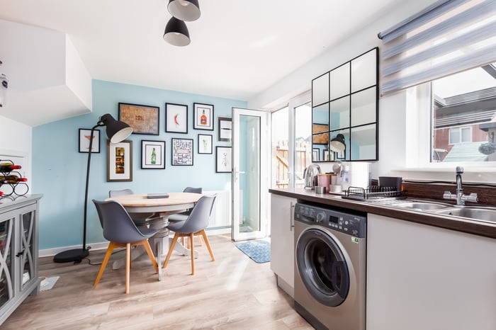Whilst set off the living room, the stylish kitchen offers ample space for dining and patio doors accessing the rear garden. Modern fitted units include wood effect worktops with matching upstands and a sink with drainer; with appliances including an integrated oven and gas hob, and space for freestanding appliances.