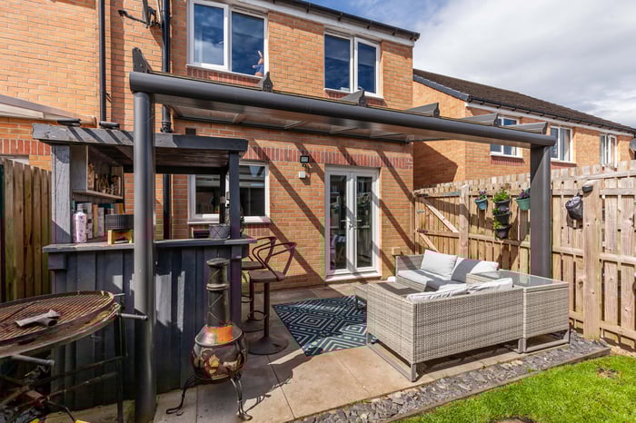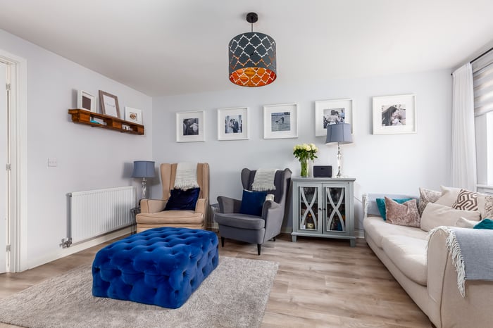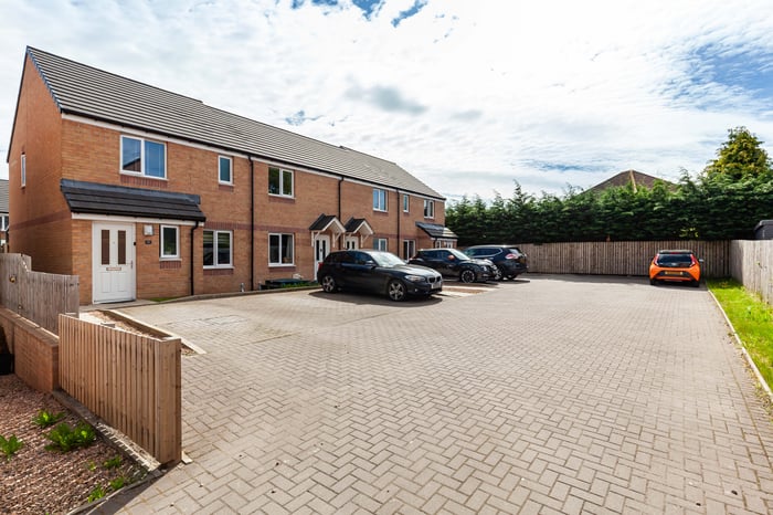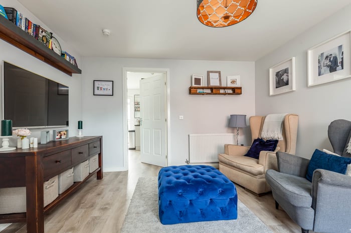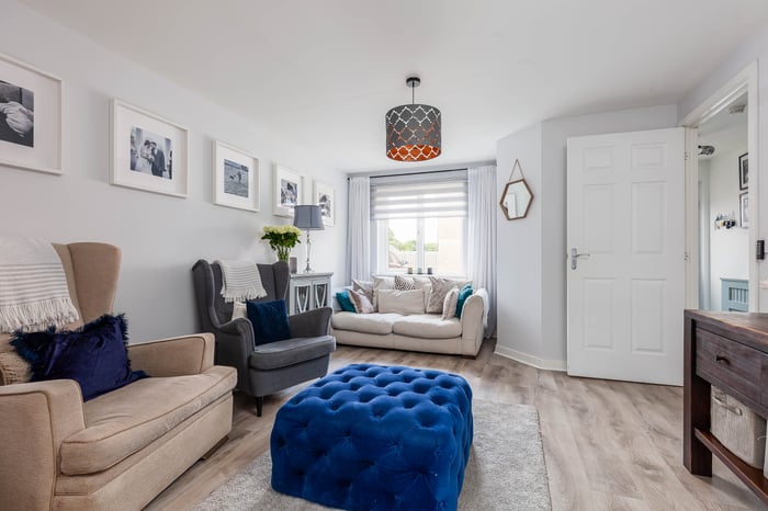 Immaculately presented, three-bedroom, end-terrace family home with a garden and driveway. Set in a modern residential development, located in the desirable rural town of Kinross, in Perth and Kinross-shire. A welcoming entrance affords access to the carpeted stairs leading to the upper hall, a convenient WC, and the front-facing living room which features wood effect flooring continuing from the hall and kitchen and a central light fitting.