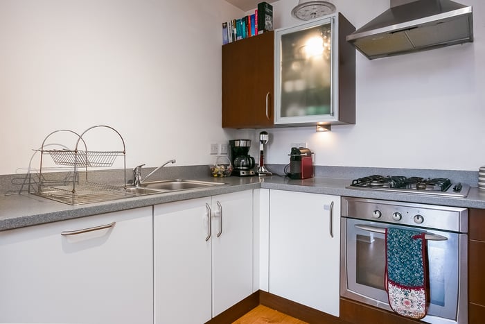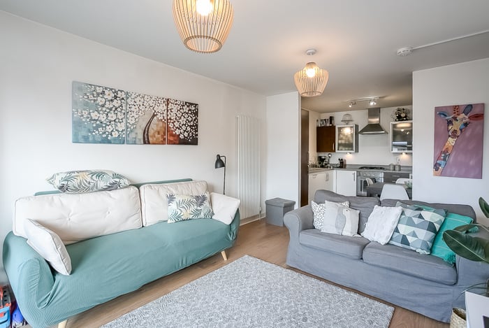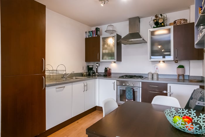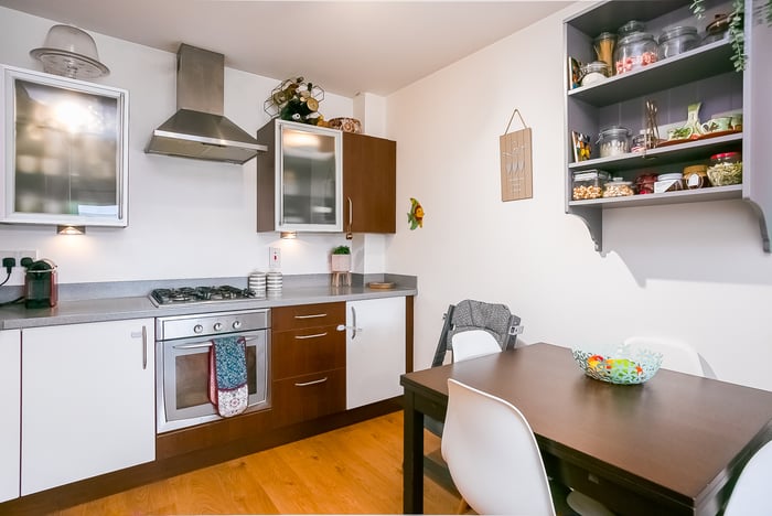 An open-plan public room offers space for both lounge and dining furniture, and features quality wood effect flooring, tall radiators, two pendant light fittings, and access to the balcony terrace. Set to the rear of the room, the kitchen is fitted with modern units, stone effect worktops with matching upstands, a sink with a drainer, unit downlighting, and an integrated fridge/freezer, dishwasher, oven and gas hob.