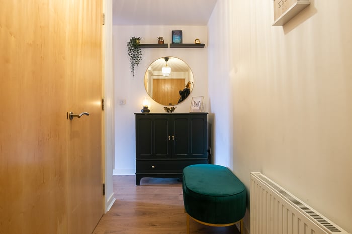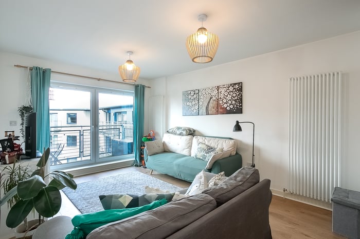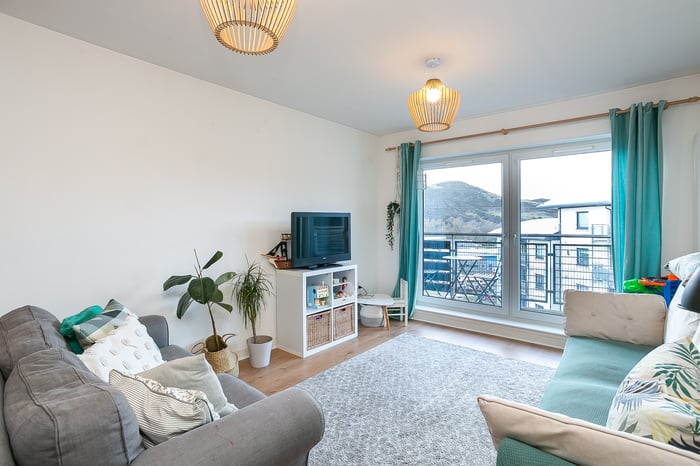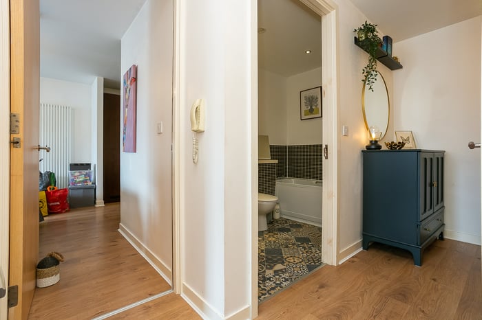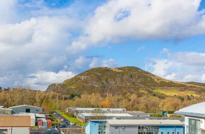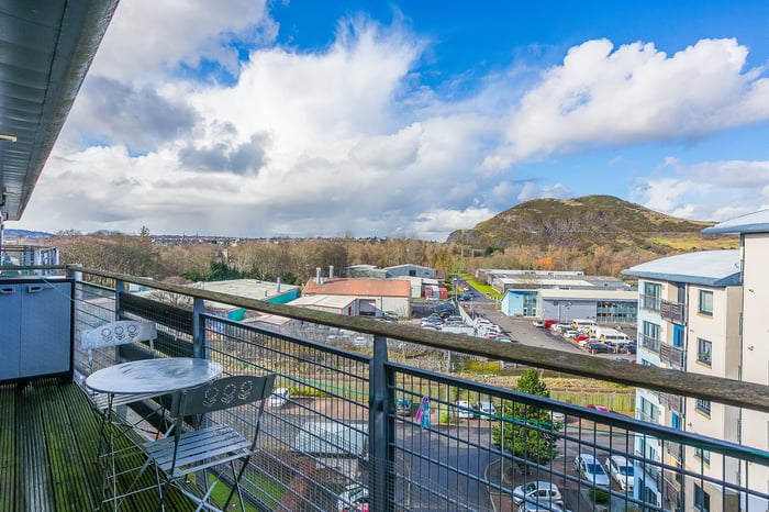 Beautifully presented, two-bedroom, fifth (top) floor flat, with private balcony and superb views to Arthur’s Seat and the city skyline. Set in a factored, residential development, located in the popular Peffermill area, southeast of Edinburgh city centre. A welcoming L-shaped entrance hallway gives access throughout the property, including to the built-in store cupboard, and the utility cupboard.