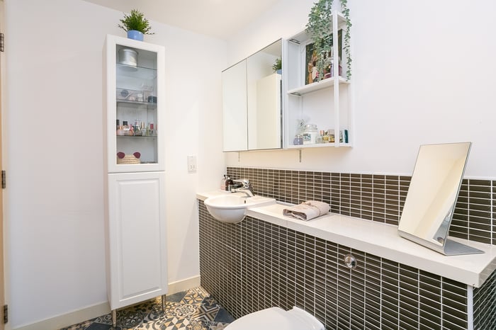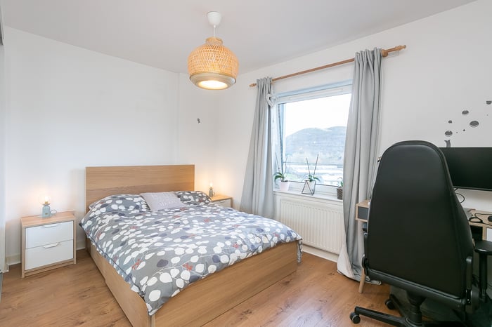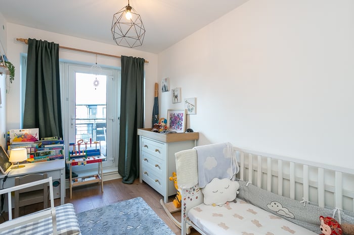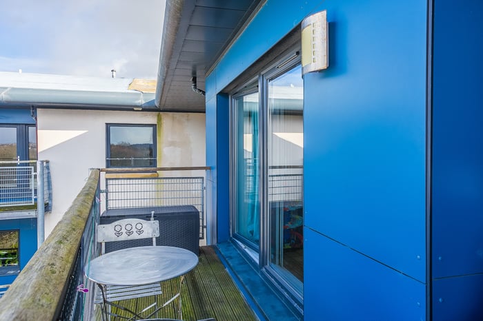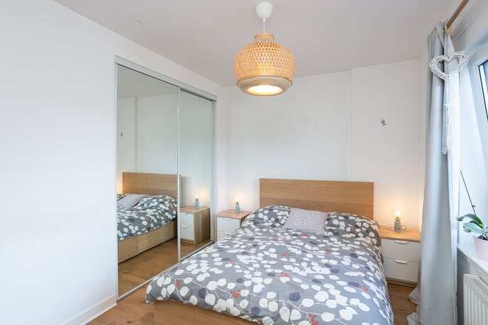 A spacious master bedroom is finished with light decor and features a built-in wardrobe with mirror sliding doors and a stylish en-suite shower room. A second flexible bedroom also has access to the balcony and features wood-effect flooring and a central pendant light fitting.