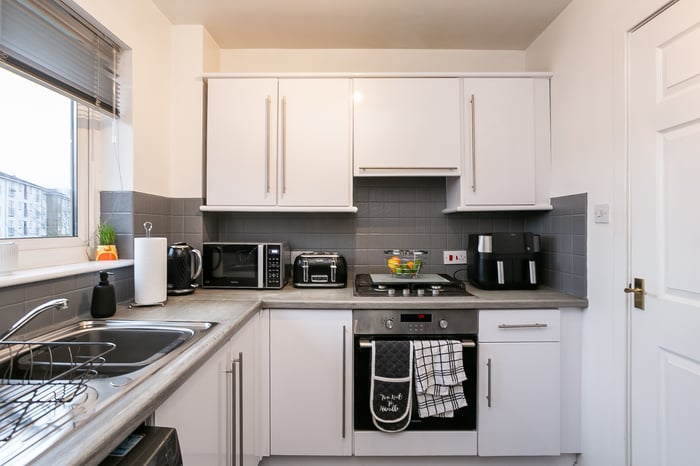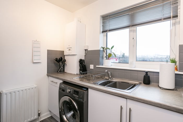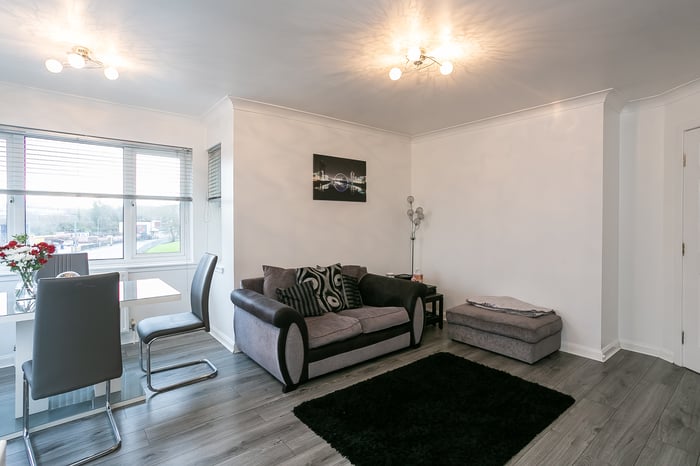 Set to the front, a tastefully finished living/dining room features a corner aspect window allowing plentiful natural light, plain coving, and plenty of room for both lounge and dining furniture. A stylish kitchen is fitted with modern units, wood effect worktops, a tiled surround, a sink with a drainer, an integrated oven and gas hob, and includes a freestanding fridge/freezer and washing machine.