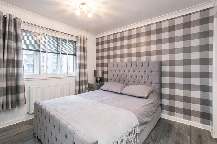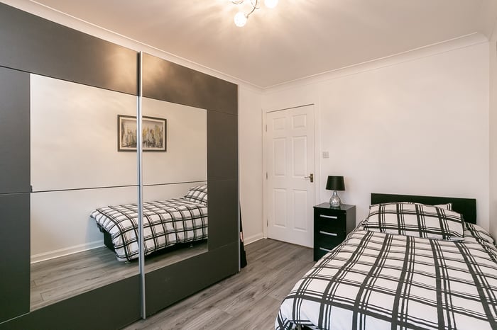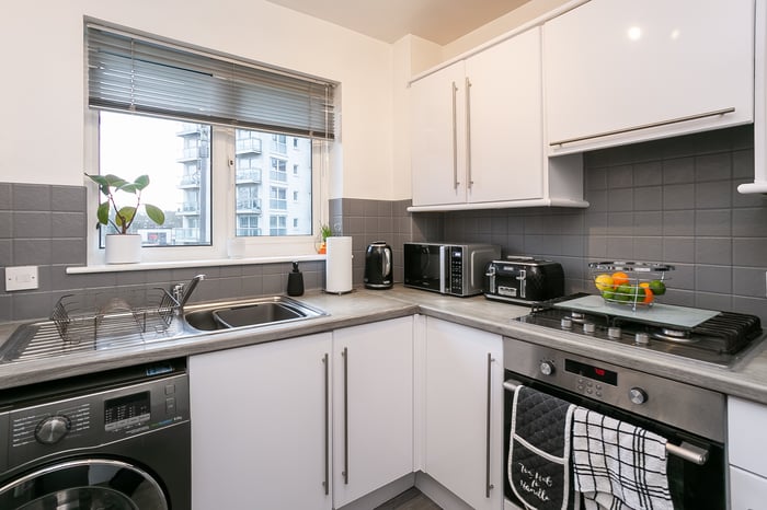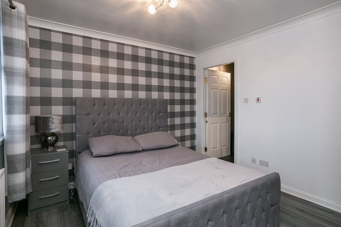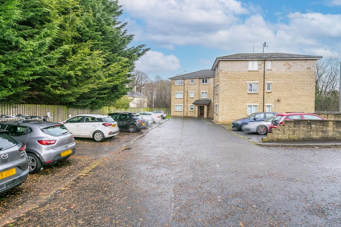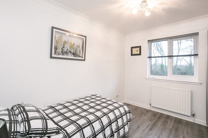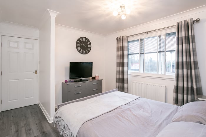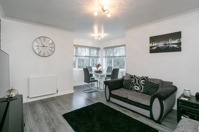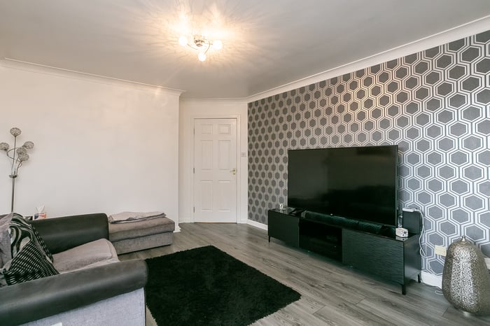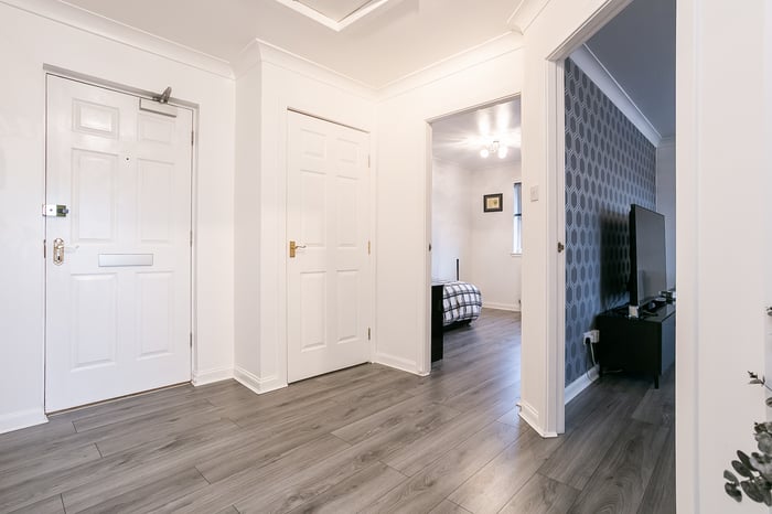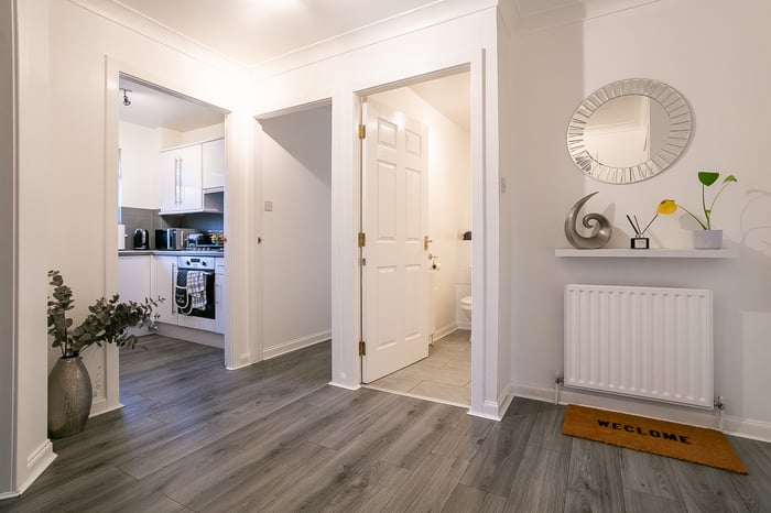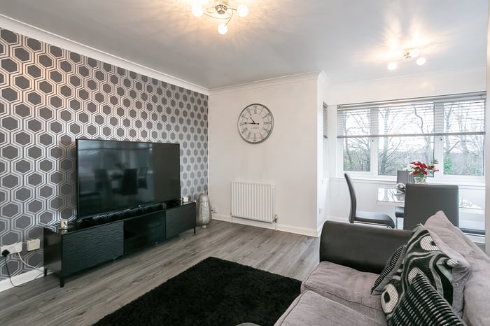 Immaculately-presented, two-bedroom, corner aspect, second (top) floor apartment, with an allocated parking space. Set in modern, factored, residential development in Cambuslang, southeast of Glasgow. A welcoming entrance affords access throughout the property and features a built-in cupboard and modern wood effect flooring continuing throughout the majority of the rooms.