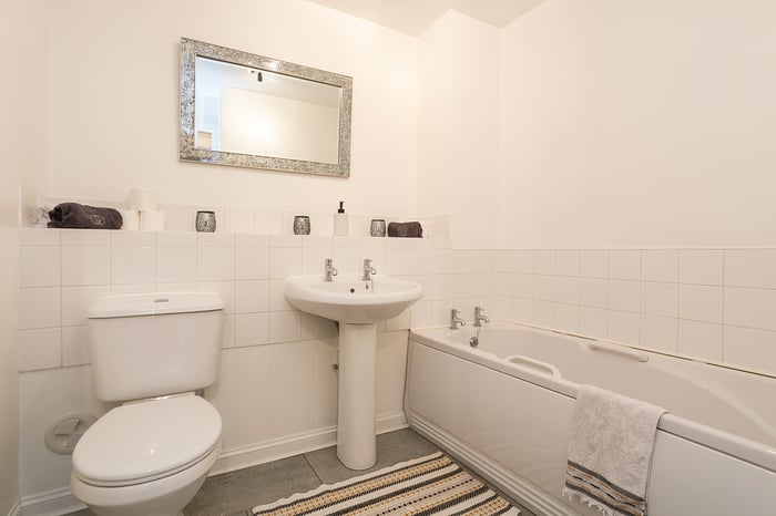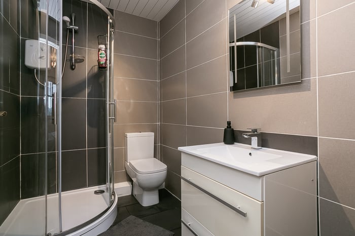 A good-sized master bedroom has a TV point and an en-suite shower room with a modern suite, a corner cubicle with an electric shower unit and tiled splash walls; whilst a further bedroom is set to the opposite aspect. Completing the accommodation, the bathroom is set internally off the hall, including a three-piece suite.