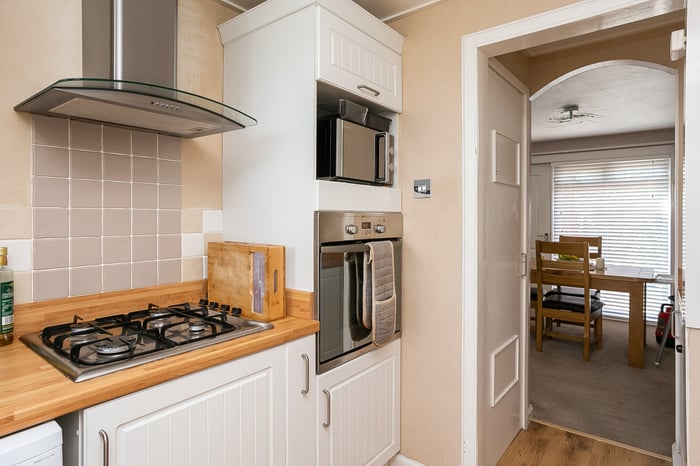 Semi-open to the dining area, the stylish kitchen is fitted with modern units, wood effect worktops with matching upstands, a tiled surround, a sink with drainer, and an integrated oven and gas hob; whilst also featuring further built-in storage. On the upper hall, bedroom one is set to the rear, finished in light neutral decor, carpeted flooring and a large built-in wardrobe with a mirror sliding door; whilst two further bedrooms are set to opposite aspects, both well-finished, also with carpeted flooring, with bedroom two featuring a deep open-press cupboard, and bedroom three a built-in cupboard.