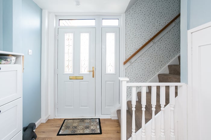 A welcoming entrance features built-in storage, and affords access to the carpeted stairs leading to the upper hall and the rear-set public room. With two large windows allowing plentiful natural light, the living room has carpeted flooring and ample space for a dining area, and affords access to the porch allowing further access to the garden.