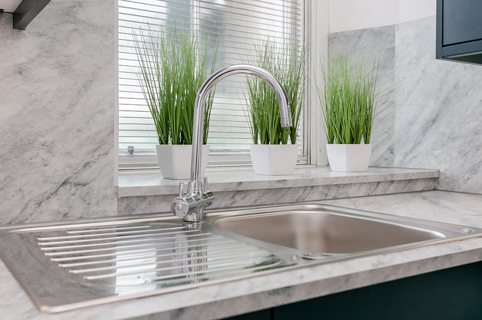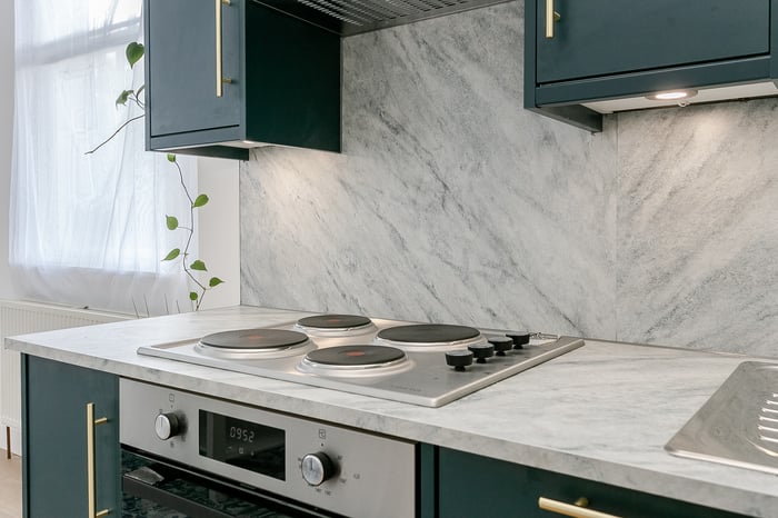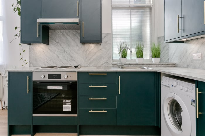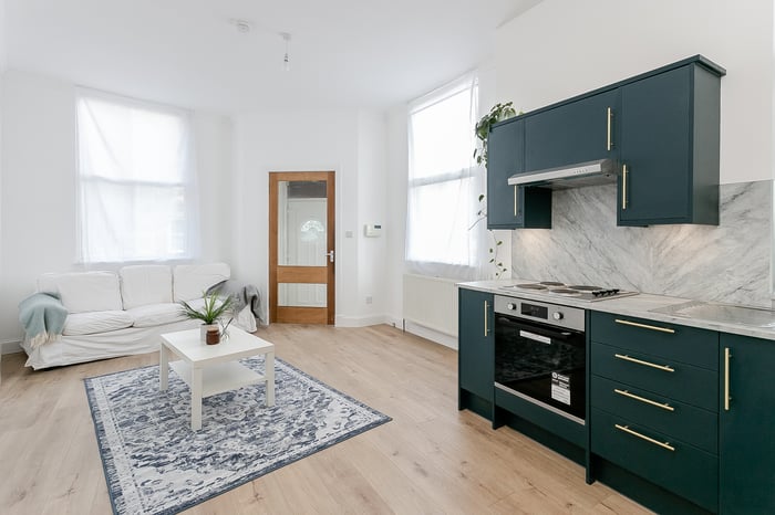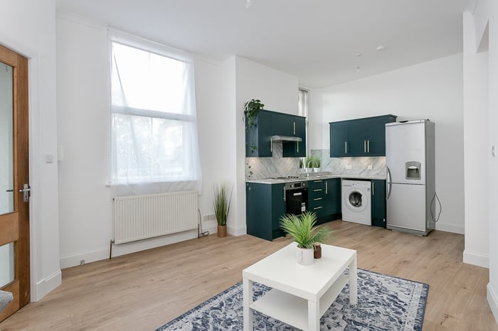 With a dual-aspect outlook, this area is bathed in natural light and features tasteful light décor and wood-effect flooring throughout. The newly installed kitchen is both modern and functional, complete with stylish units, stone-effect worktops and matching splashbacks, a sink with a drainer, an integrated oven and electric hob with extractor hood, and freestanding appliances including a fridge/freezer and washing machine.