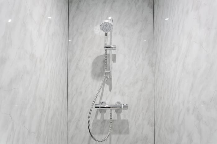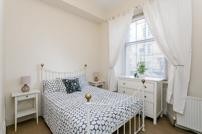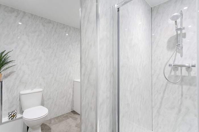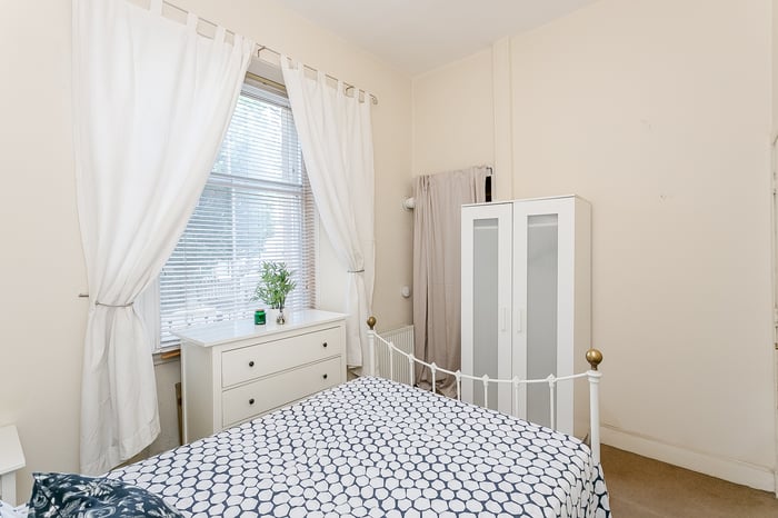 The well-proportioned double bedroom enjoys a peaceful side-aspect window and includes a traditional press cupboard that houses the central heating system, with ample space for additional freestanding furniture. A stylish and recently upgraded shower room completes the accommodation, offering modern splash-panelled walls, tiled flooring, recessed spotlights, a ladder-style heated towel rail, and a fresh, contemporary finish.