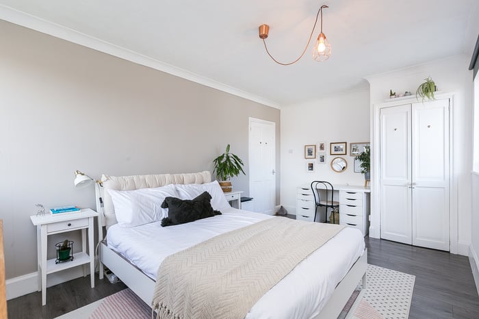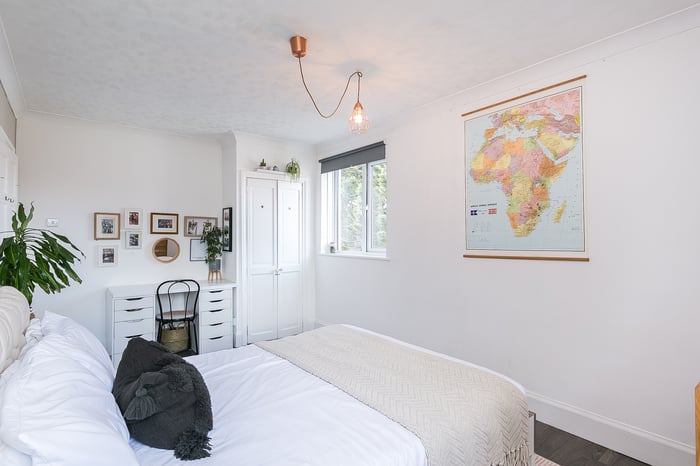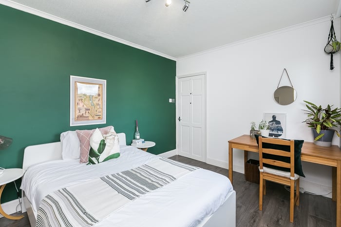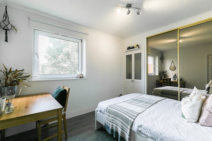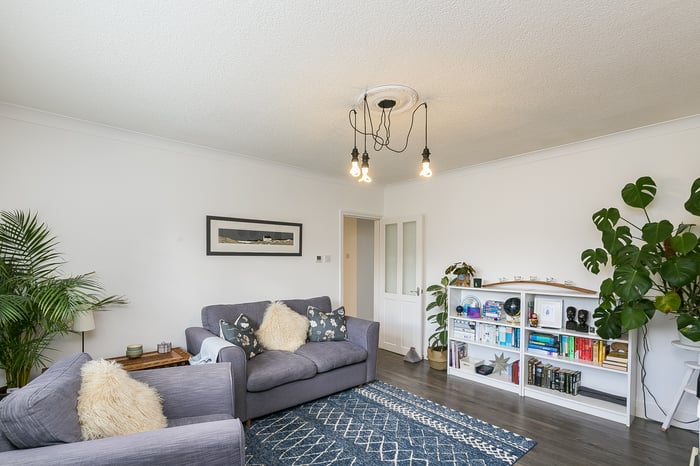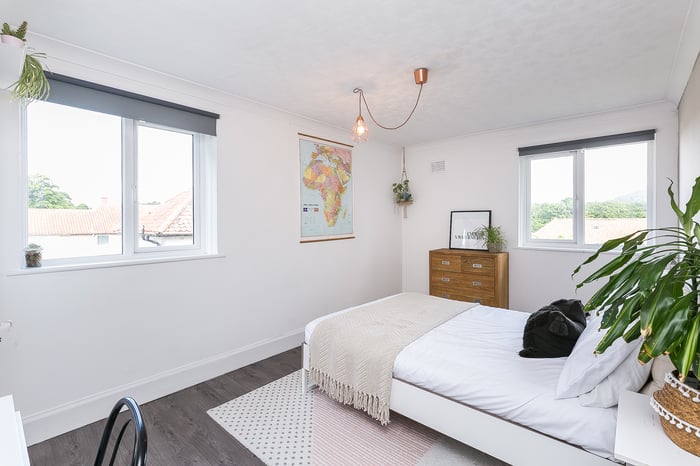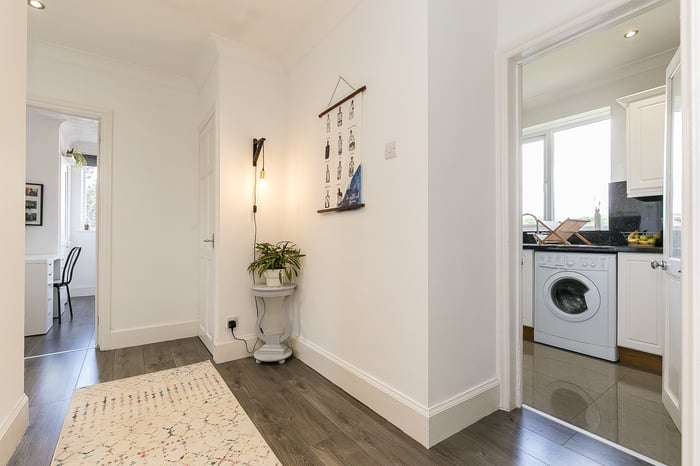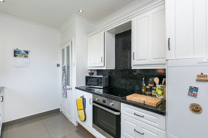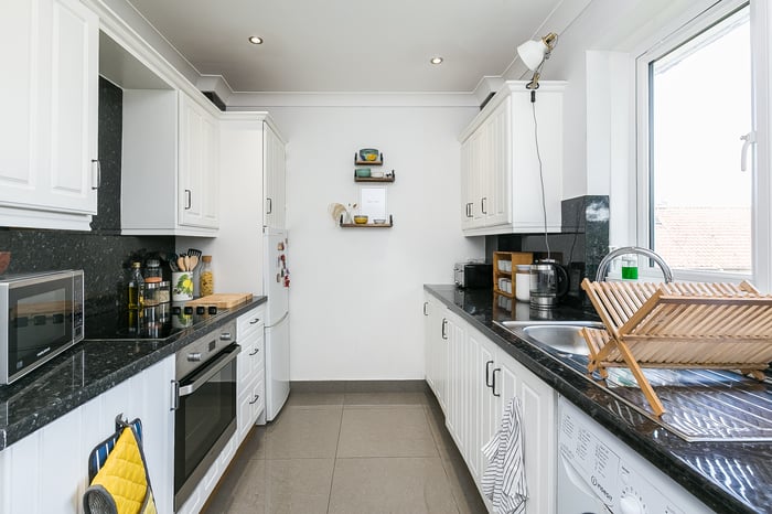 Rear facing is the kitchen with fitted units, stone-effect worktops with matching surround, sink with drainer, fridge/freezer, washing machine and an integrated electric oven and ceramic hob. Bedroom one is a particularly spacious double, with dual-aspect views and a built-in store.