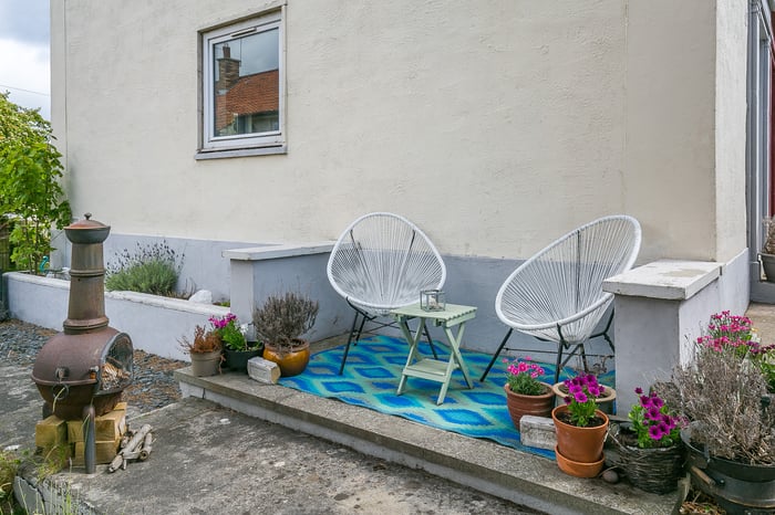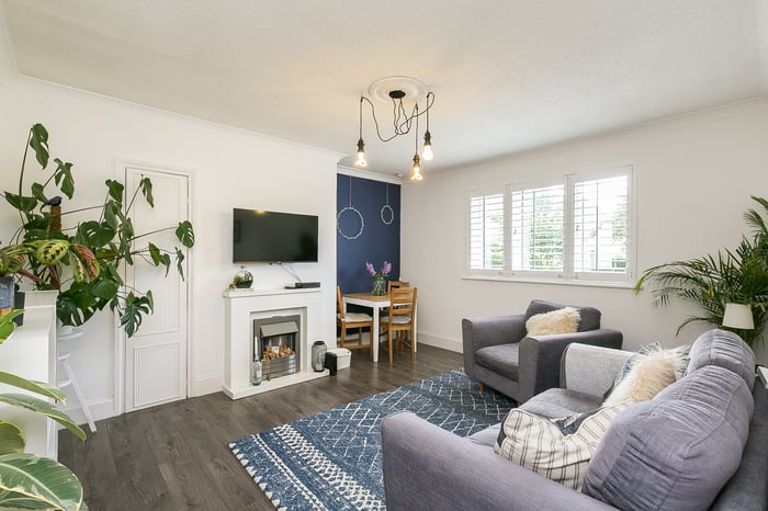 The main hall has space for freestanding furniture and two built-in storage cupboards whilst stylish wood-effect flooring is matched throughout the living spaces. To the front, a public room has space for lounge and dining furniture, and includes a press cupboard (also housing the immersion heater) and a contemporary feature fireplace.