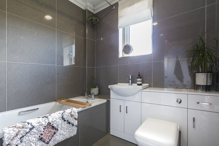 Bedroom two also has a rear view to the Arthur’s Seat and features a built-in store and a built-in mirrored wardrobe. The stylish bathroom is fully tiled, and has a fitted suite, including a shower unit over the bath and a built-in storage cupboard.