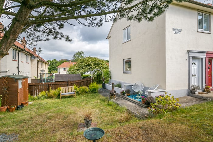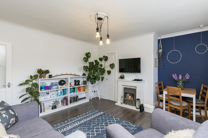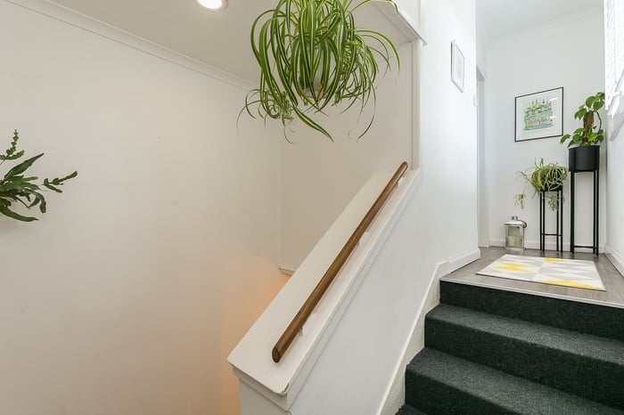 Light and beautifully presented, two-bedroom, upper villa set on a generous south facing corner plot with gardens to three aspects. Located on a crescent with a shared green, in the established area of The Inch, south of Edinburgh city centre. The entrance hall offers extensive storage and space for outwear, with carpeted flooring continuing up the stairway to the upper floor.