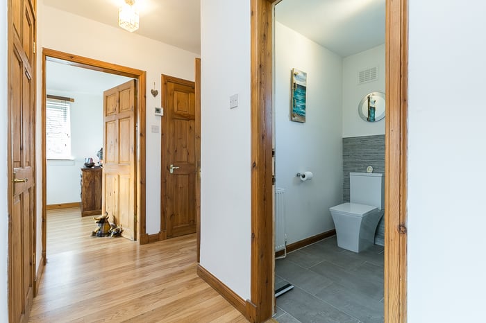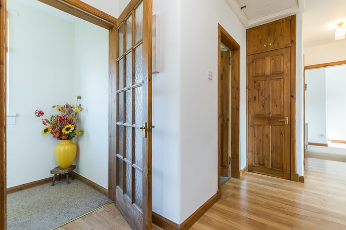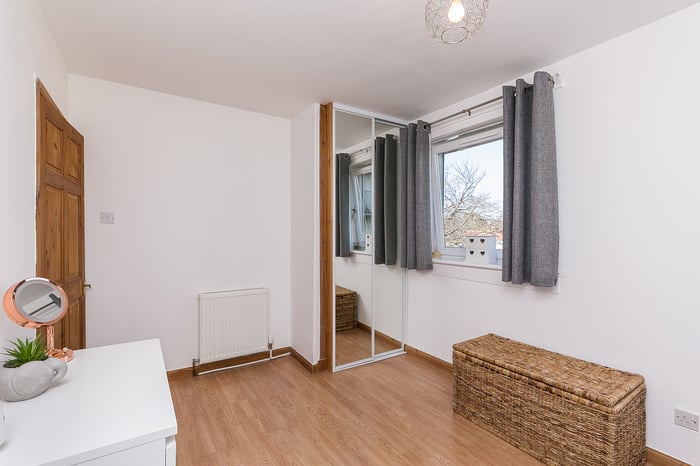 Light and beautifully presented, two-bedroom, upper villa set on on a generous plot with gardens and a driveway. Located in the established area of The Inch, south of Edinburgh city centre. The entrance hall has space for outwear, a deep undertaker storage area, and features carpeted flooring continuing up the stairway to the upper floor.