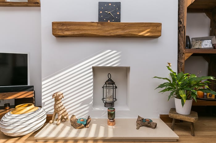 The spacious dual-aspect lounge has a feature wall with a solid wood mantel, a central light fitting and modern flooring that runs continuously from the hall. Rear-facing, a good-sized kitchen has tiled flooring, recessed spotlighting and offers space for a dinner/breakfast table.