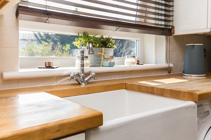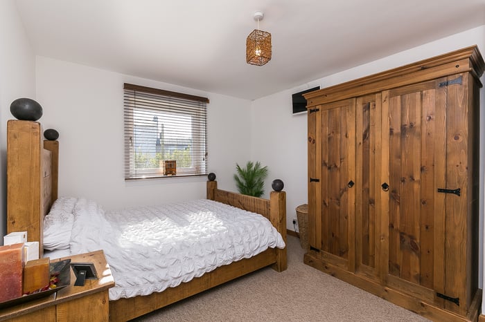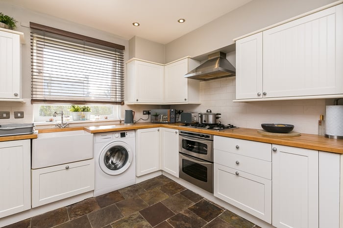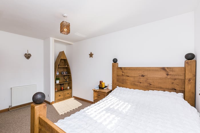 Fitted units include real-wood worktops, a tiled surround, ceramic ‘Belfast’ style sink, a freestanding washing machine, and an integrated fridge/freezer, dishwasher, double oven, gas hob and extractor hood. Two well-proportioned bedrooms are set to either aspect, with rear-facing bedroom one including carpeted flooring, a recess wardrobe space, and ample space for freestanding storage; whilst front-facing bedroom two has wood-effect flooring and a built-in mirrored wardrobe.