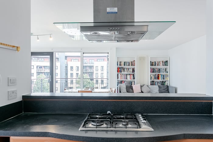The modern open-plan kitchen is fitted with stone-effect worktops, spotlighting, and a sink with a separate drainer. Quality appliances include an integrated fridge/freezer, oven, and gas hob with a canopy above, making it a practical and stylish space for cooking and dining.