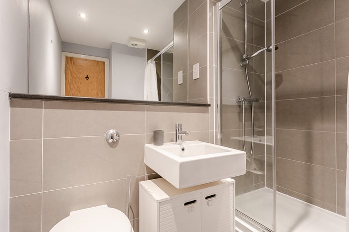 Both bedrooms offer flexibility for a variety of furnishings and are designed with comfort in mind. Completing the property, the contemporary three-piece bathroom is fitted with tiled-effect flooring, a tiled splashback surround, a stone-effect countertop, and a shower over the bath, while a central light fitting with multi-coloured bulbs adds a modern touch.