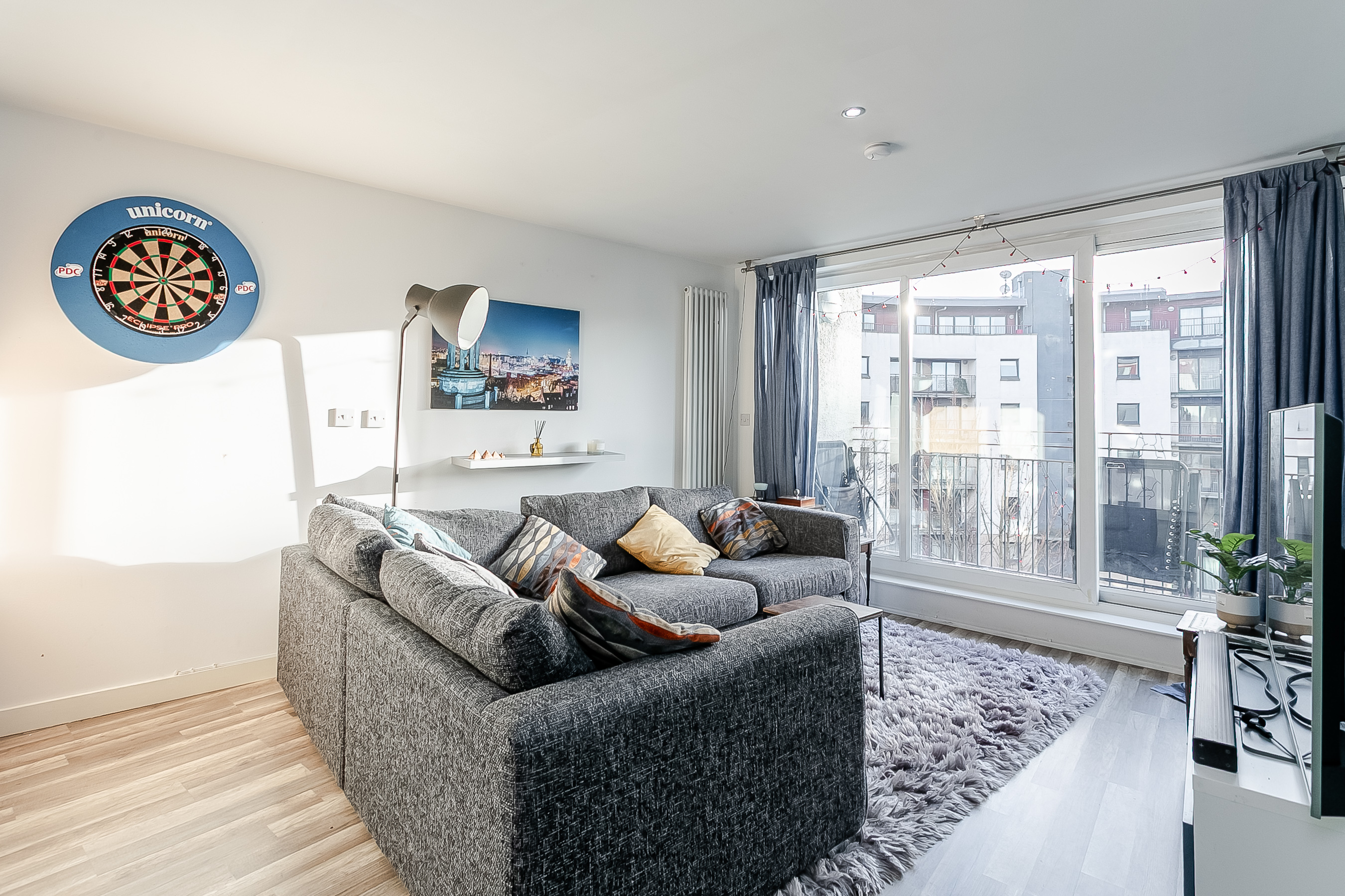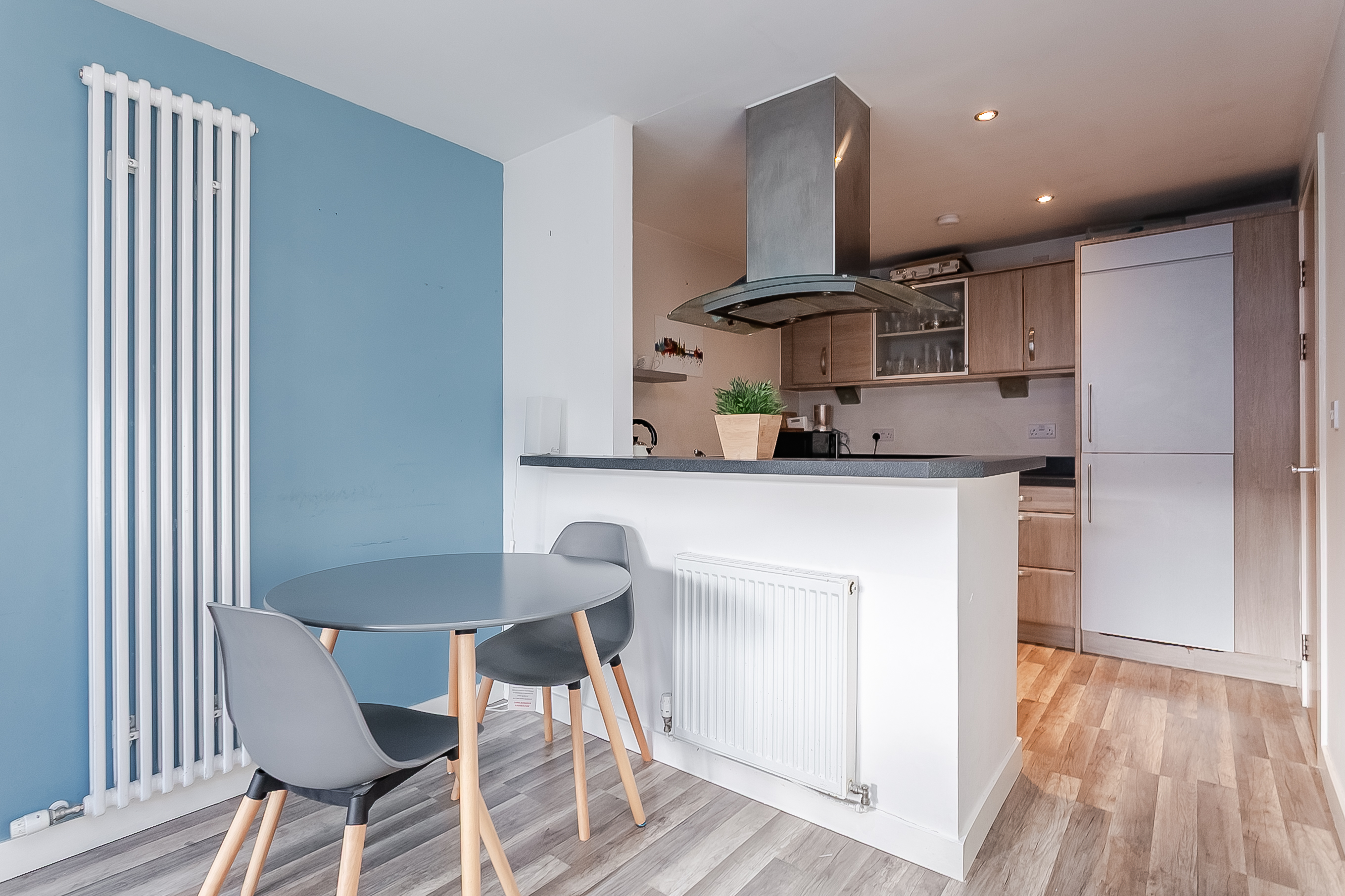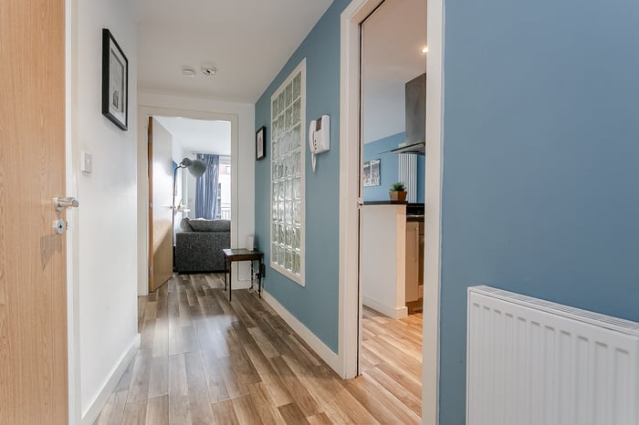 A welcoming entrance hall provides access throughout the flat and offers excellent storage via two built-in cupboards. To the front, the bright and spacious open-plan lounge/kitchen provides ample room for both living and dining, complemented by wood-effect flooring, spotlighting, and direct access to the private south-facing balcony, allowing an abundance of natural light.