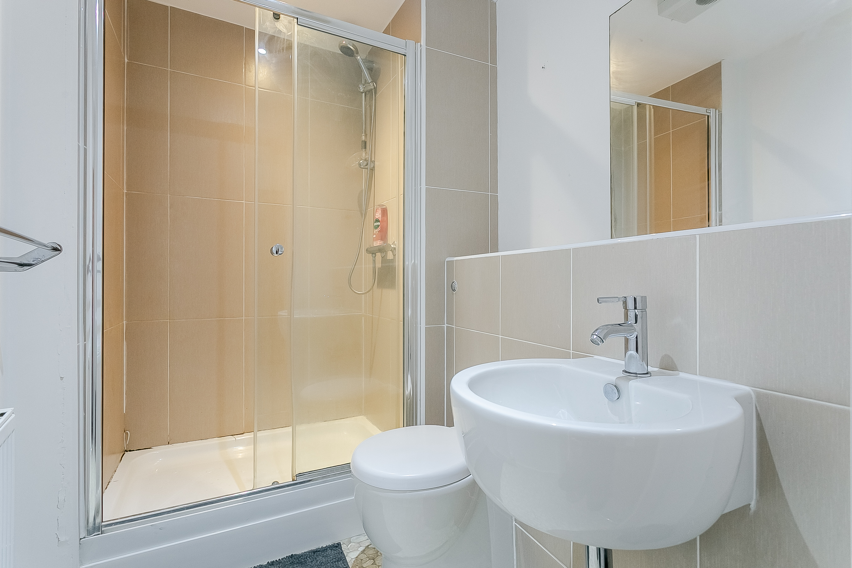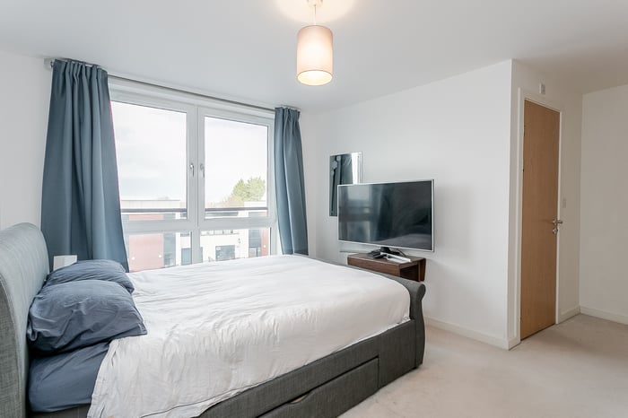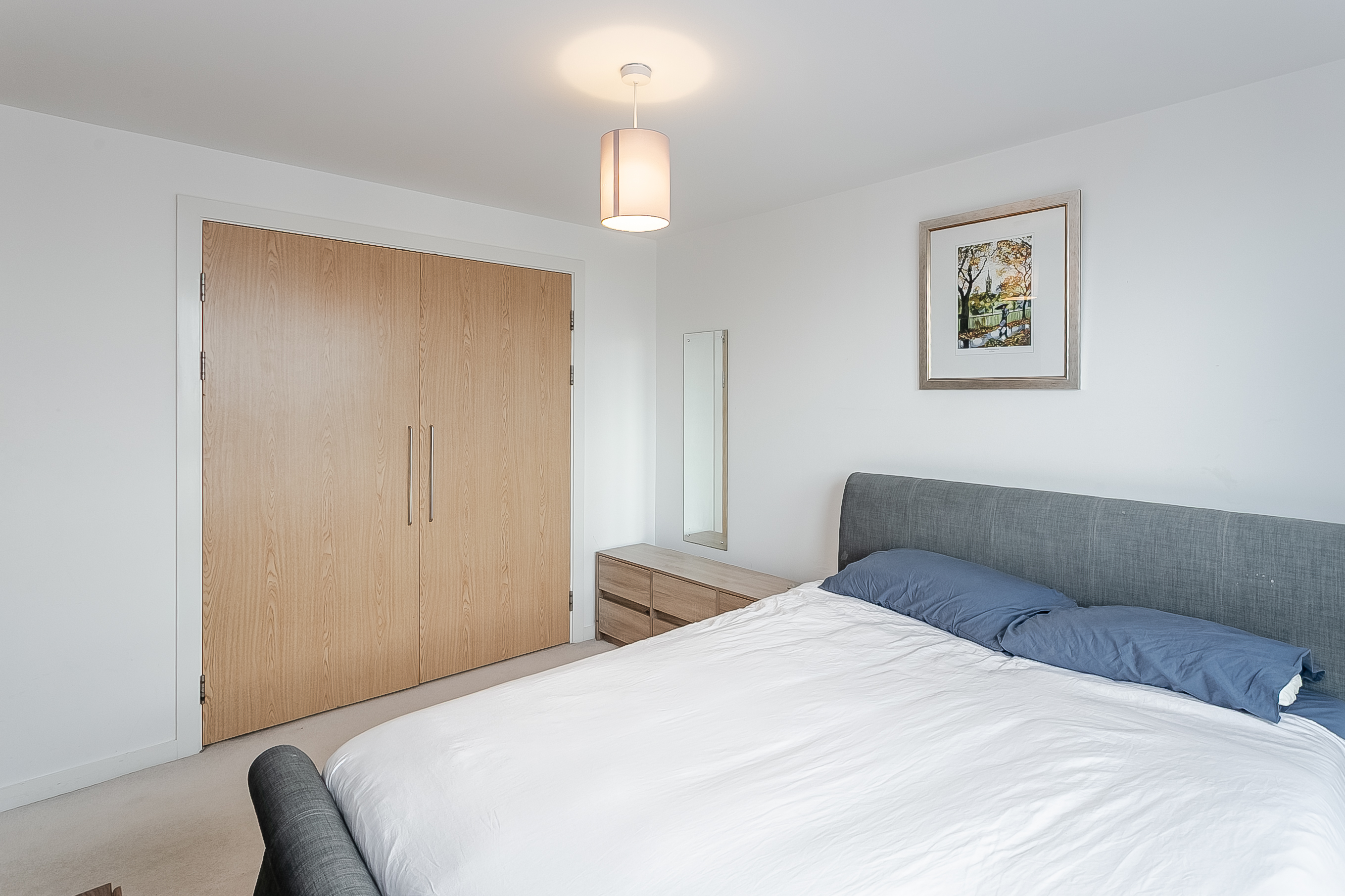 The well-proportioned principal bedroom is positioned to the rear, and features carpeted flooring, light decor, a built-in wardrobe, and a stylish en-suite shower room. A second double bedroom lies to the front and also benefits from a built-in wardrobe.