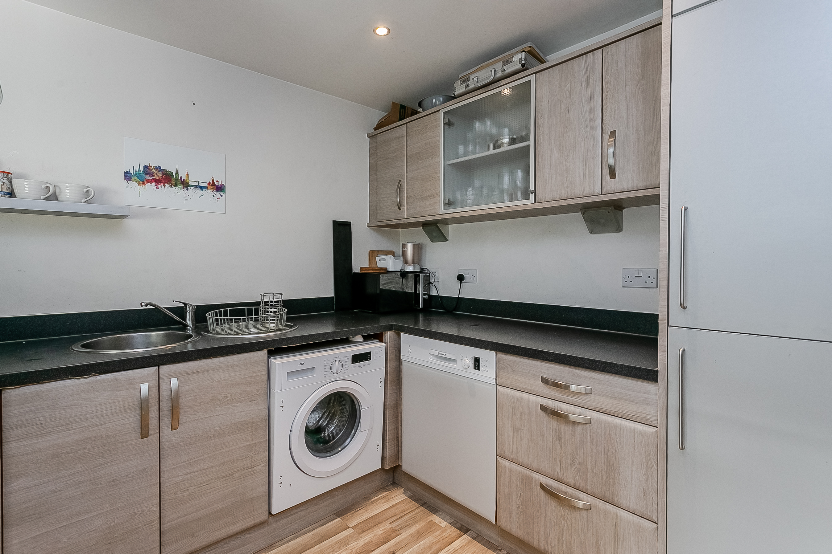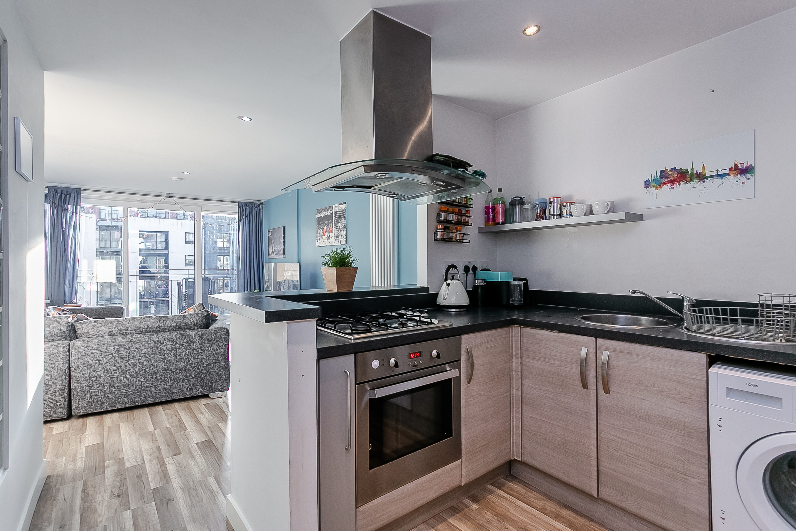 The contemporary kitchen, located to the rear of the living space and accessible from both the lounge and hallway, is fitted with modern units and stone-effect worktops. Integrated appliances include an oven, gas hob, and fridge/freezer, alongside a sink with drainer, and a freestanding washing machine and dishwasher.