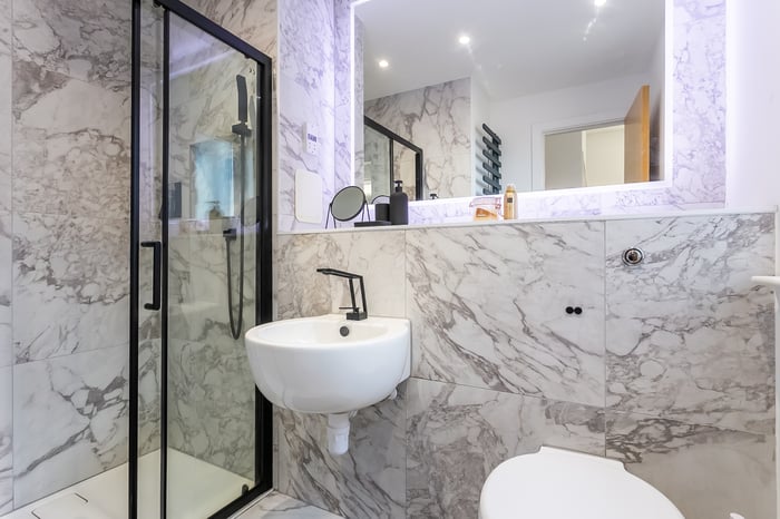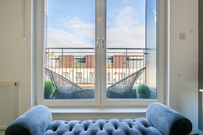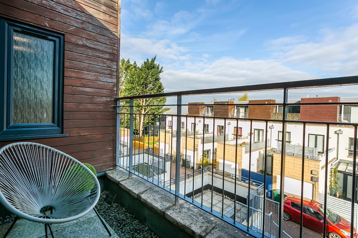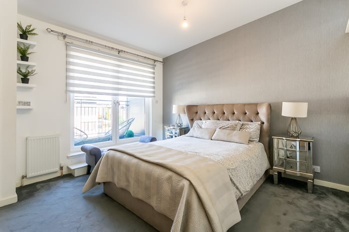 On the second floor, a carpeted landing has a built-in store cupboard and gives access to a generous dual-aspect master bedroom featuring a built-in wardrobe (with further access to the floored eave space), a private balcony; and an en-suite shower room, fitted with a stylish suite including a rainfall showerhead, marble effect tiling, and a ladder-style radiator.
