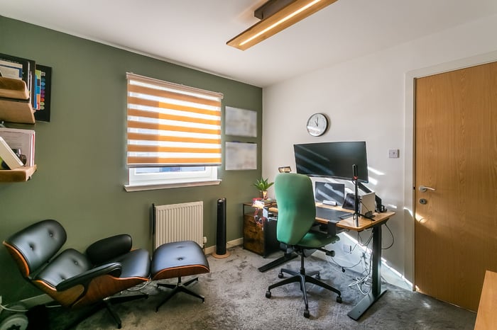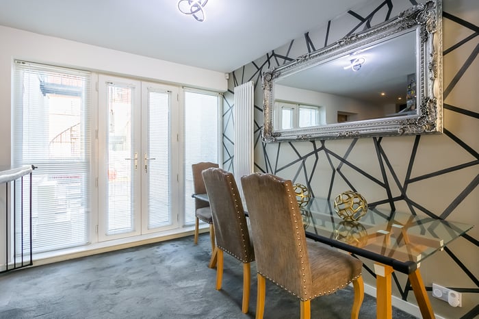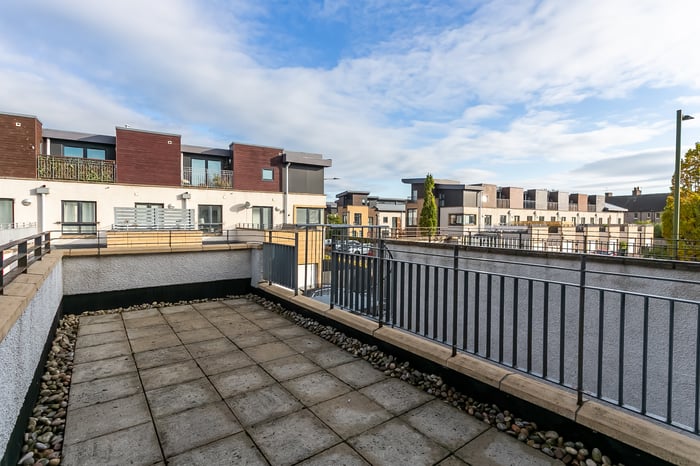 Beautifully presented and spacious, three-bedroom, modern mid-terrace townhouse, with patio garden, roof terrace, balcony and an integrated garage. Set ‘off-street’ adjacent to a shared green, in a modern, factored, residential development in the desirable Fettes area, north of Edinburgh centre. A welcoming entrance hall has ample space for outerwear and gives access to carpeted stairs leading to the upper floors, the lounge and a convenient WC with a two-piece suite. A spacious, semi-open-plan public room features a retractable door offering a flexible partition of the lounge and kitchen/dining area.