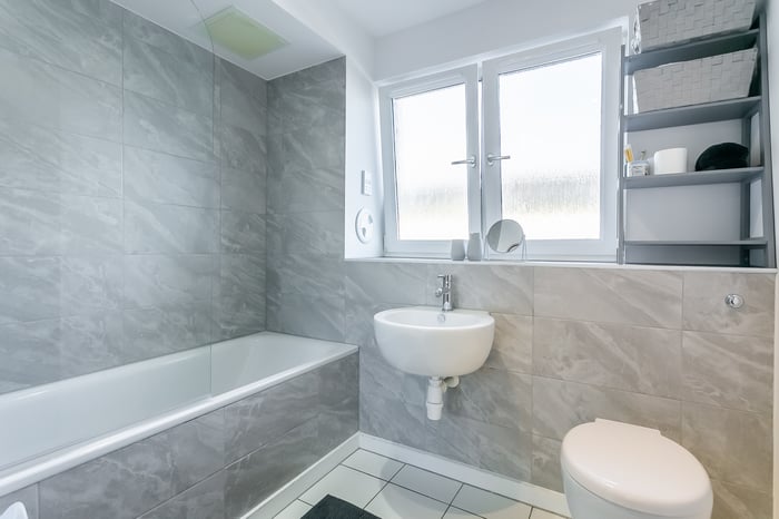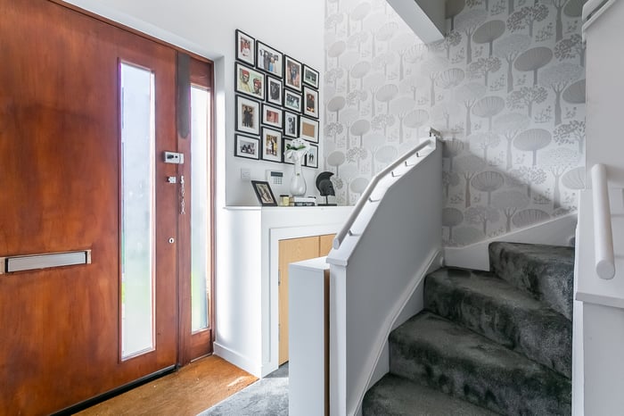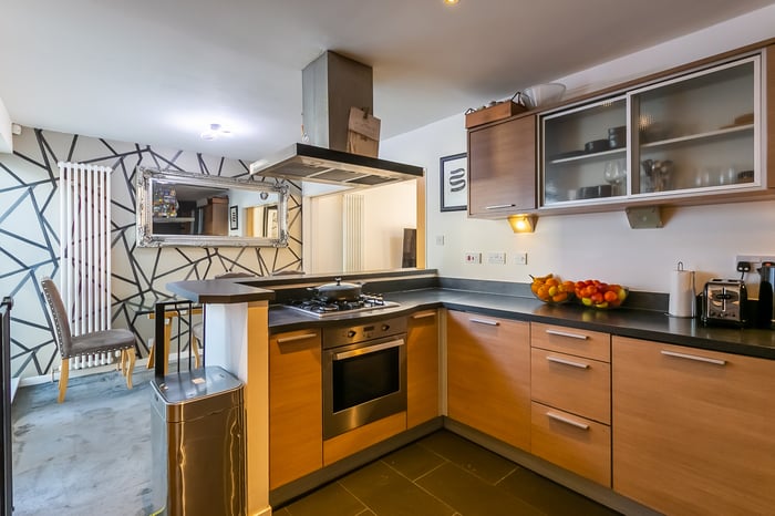 Integrated appliances include a dishwasher, washing machine, fridge, oven, gas hob and ‘floating’ canopy. On the first floor, the hall gives access to two well-proportioned bedrooms with built-in wardrobes and a contemporary family bathroom with a three-piece suite including a shower above the bath and tiled splash walls.