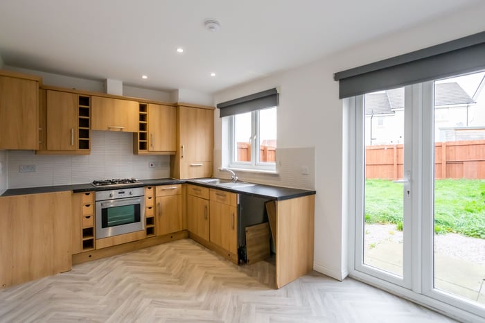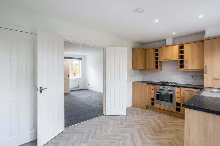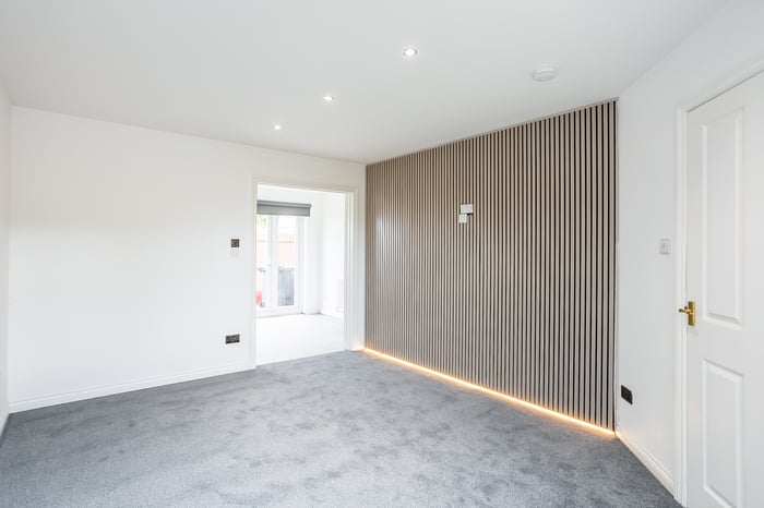 Modern wood effect flooring continues from the hall into a front-facing living room, with contemporary wall panelling and a wall-mount TV point, spotlighting, LED feature lighting, and French doors leading into the kitchen. Set to the rear, with French patio doors leading to the garden, the kitchen offers space for dining and a built-in cupboard.