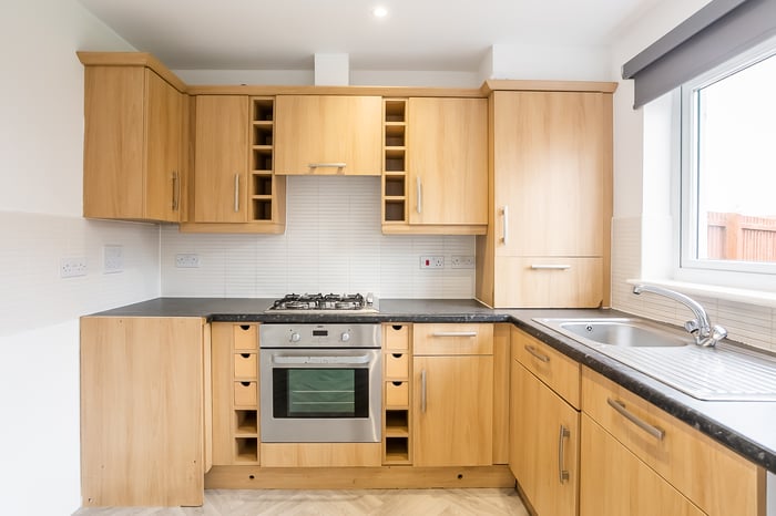Fitted wall and base units include stone effect worktops, a sink with a drainer, and an integrated dishwasher, oven and gas hob. On the first floor, bedroom one is set to the front, with built-in wardrobes, carpeted flooring, a wall-mount TV point and recessed spotlighting.