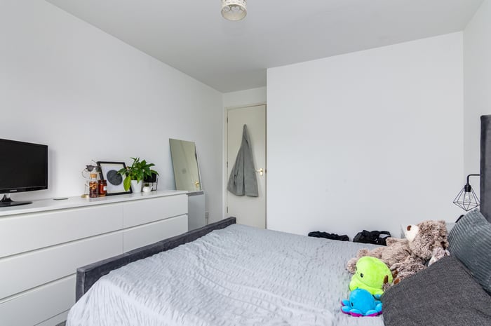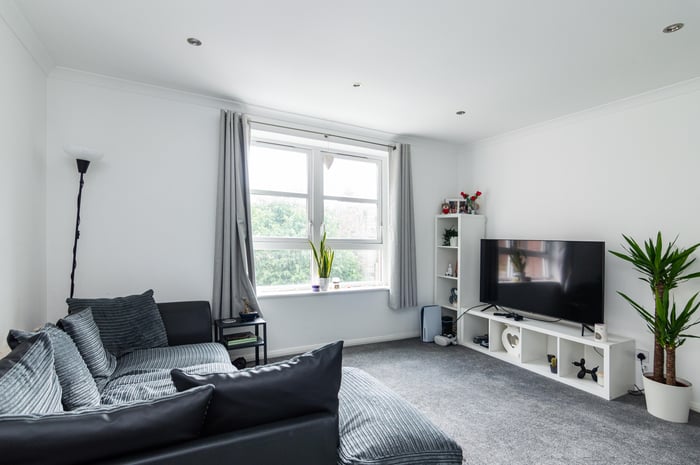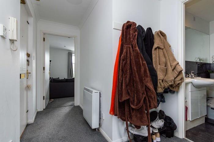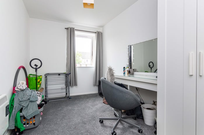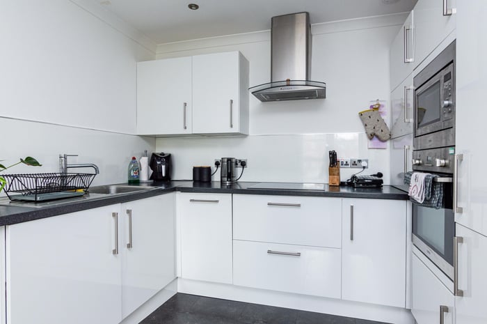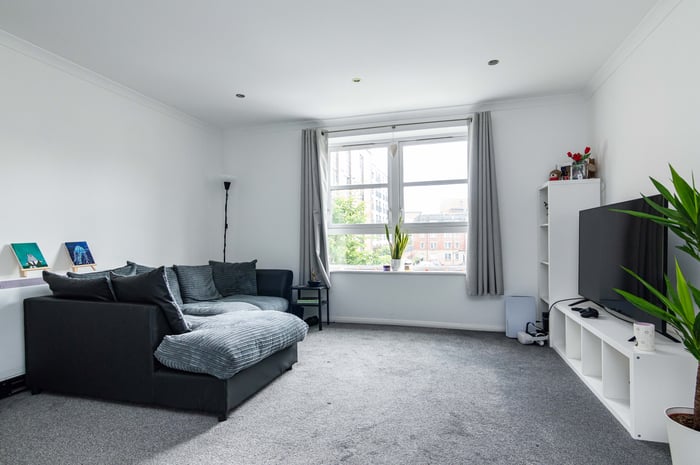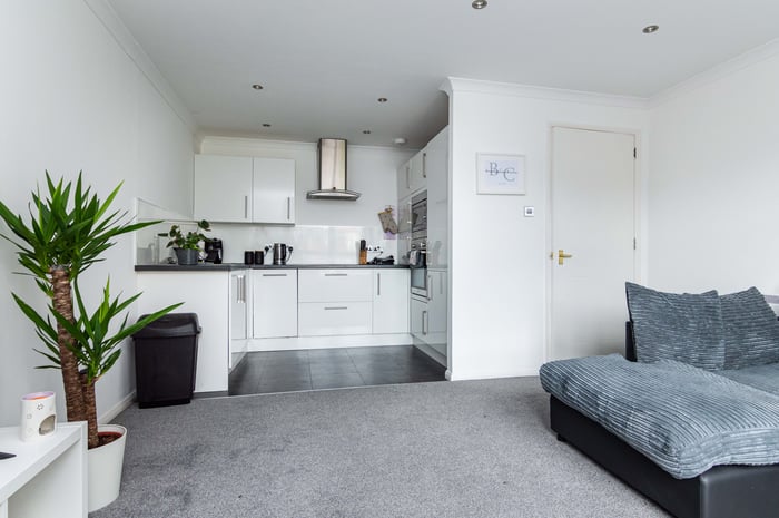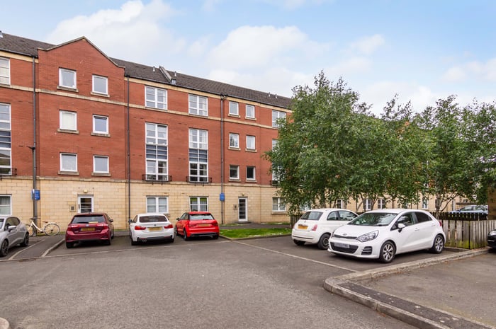 Well presented, two-bedroom, dual-aspect flat on the second floor of a modern, factored apartment block, set in a quiet residential side street in Leith, to the north of Edinburgh city centre. The entrance hall has a storage cupboard and allows access throughout the property. To the front, the southerly facing open plan living room/kitchen features a large window allowing plentiful natural light, spotlights and carpeted flooring for the living room.