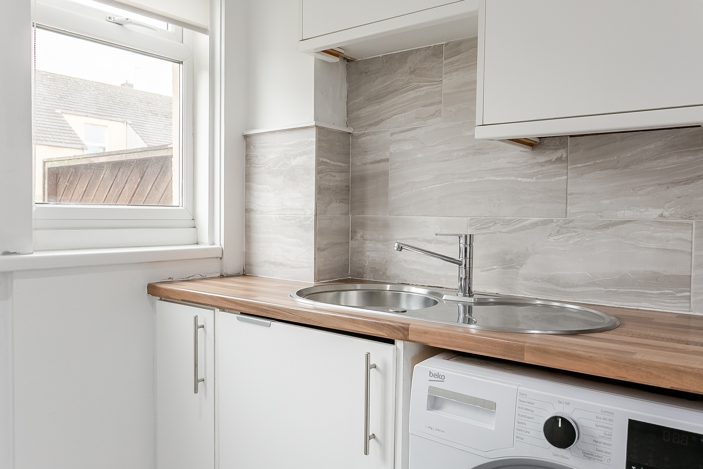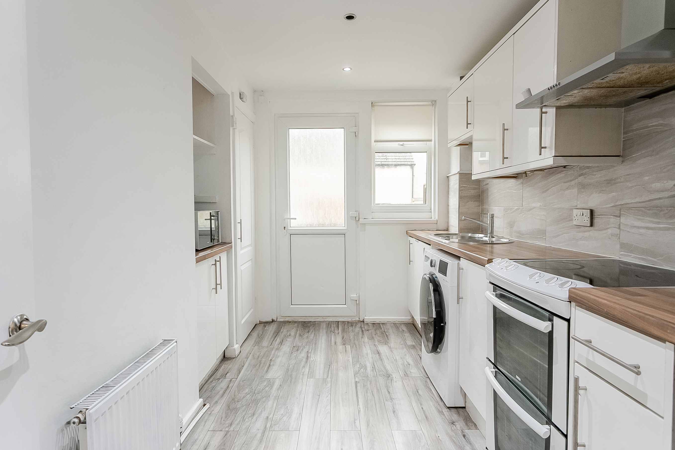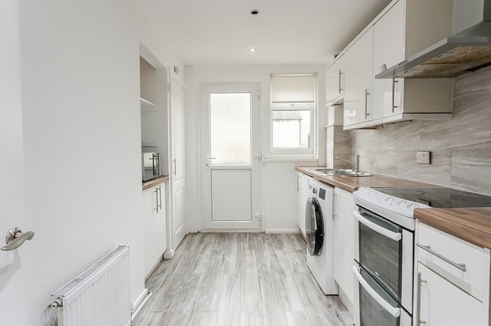 Positioned to the rear of the ground floor, the modern fitted kitchen continues the wood-effect flooring and spotlighting and is finished with wood-effect worktops and a tiled splashback. The kitchen offers excellent storage with two separate built-in cupboards and benefits from a sink with drainer, an electric cooker with gas hob, fridge/freezer and washing machine.
