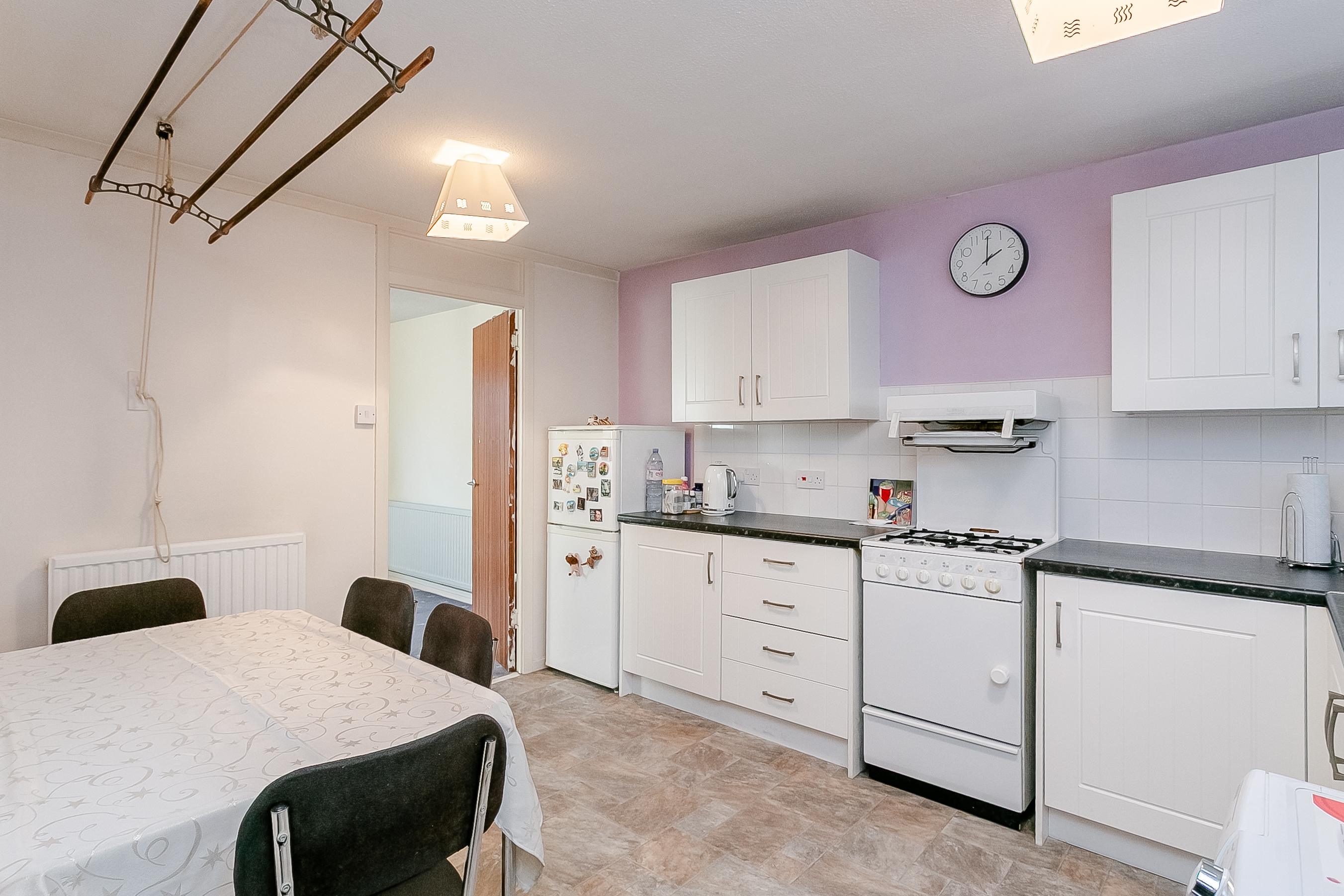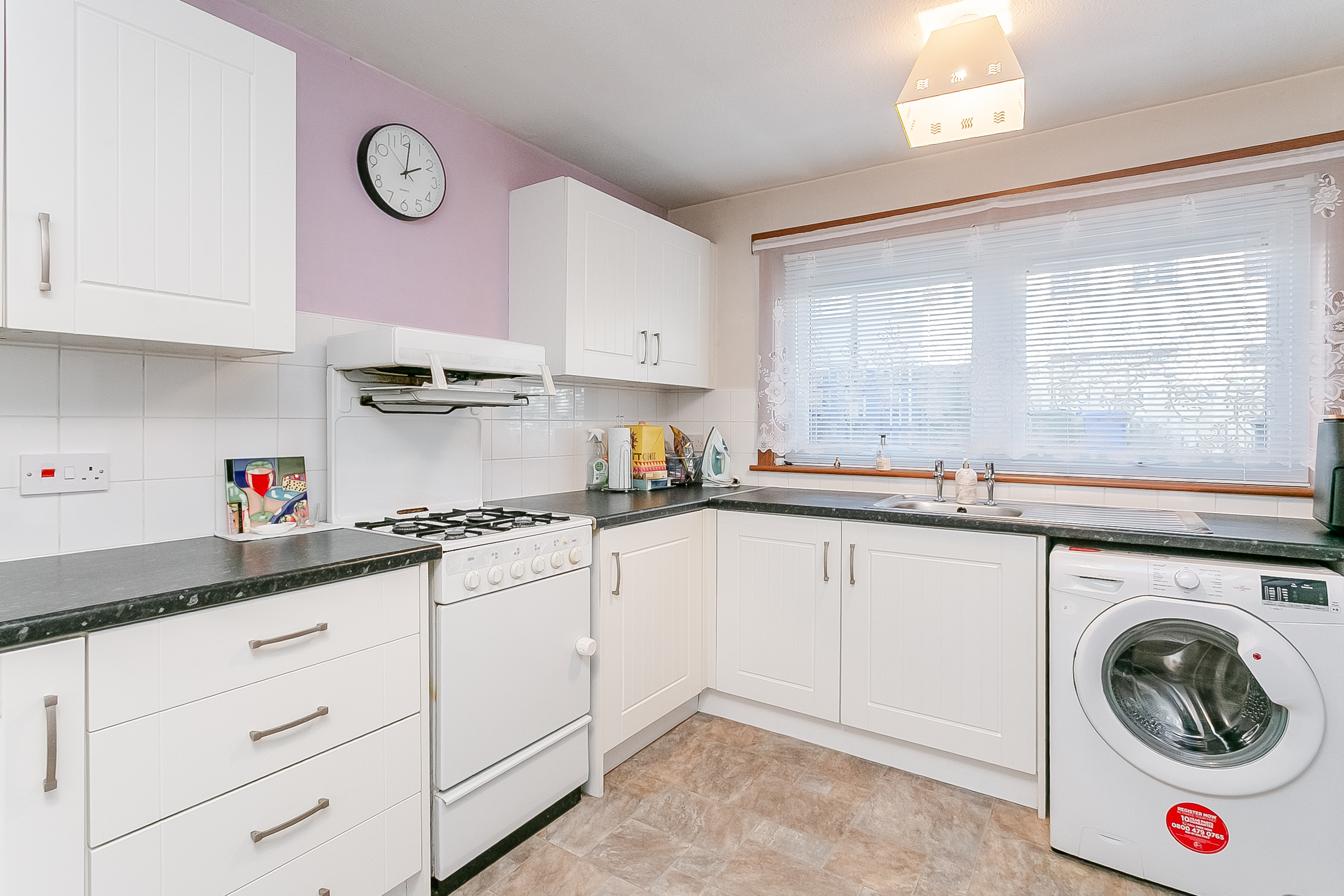 The well-proportioned kitchen can be accessed from both the hallway and living room and is fitted with a range of wall and base units, complemented by stone-effect worktops, a tiled splashback and a sink with a drainer. A selection of freestanding appliances, including a washing machine and fridge/freezer are also included.