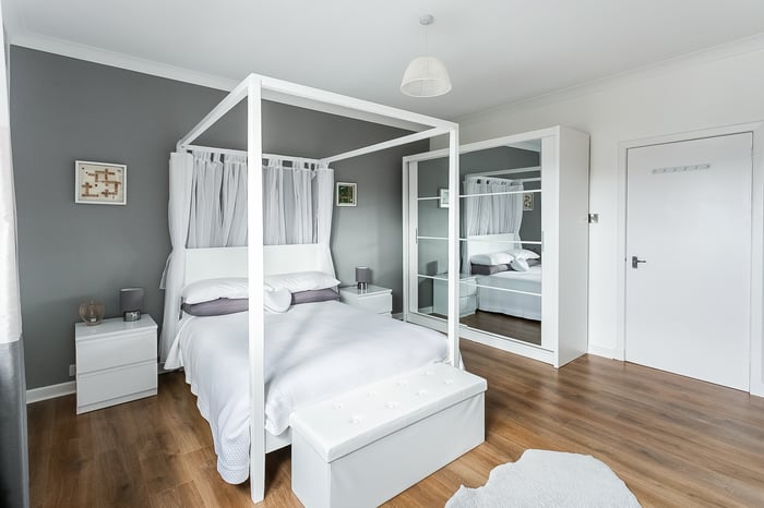 Integrated appliances include a double oven, gas hob, and fridge/freezer, as well as a freestanding washing machine — perfectly suited for both everyday living and entertaining. Completing the ground floor, bedroom three offers excellent versatility, ideal as a comfortable guest bedroom, nursery, or dedicated home office.