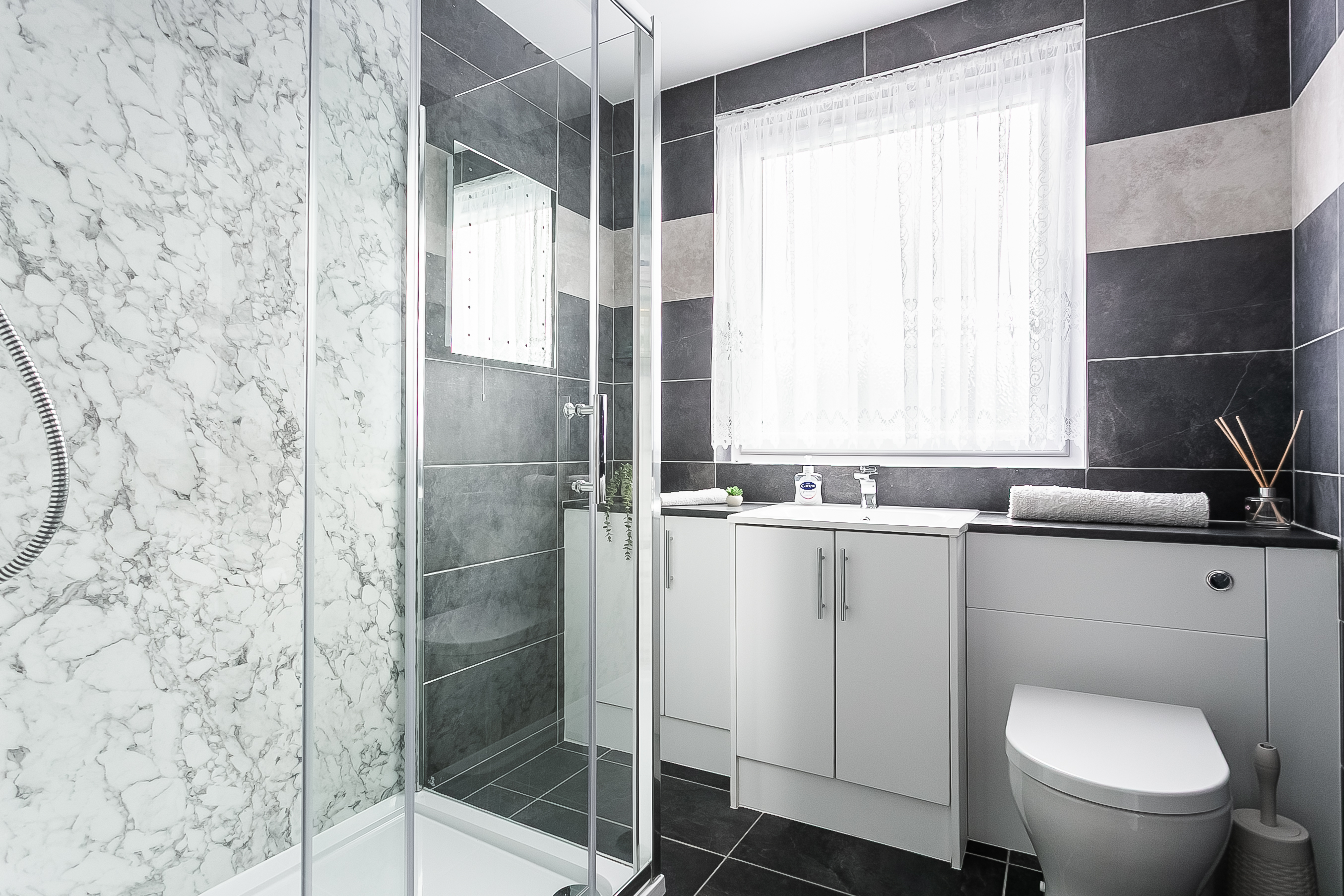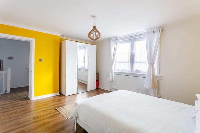 On the first floor, there is a large storage cupboard and two exceptionally spacious double bedrooms featuring continuous, attractive wood-effect flooring and ample space for freestanding furnishings. A contemporary shower room completes the accommodation, featuring a stylish rainfall shower with panelled splash walls, complemented by tiled flooring and walls for a sleek finish.