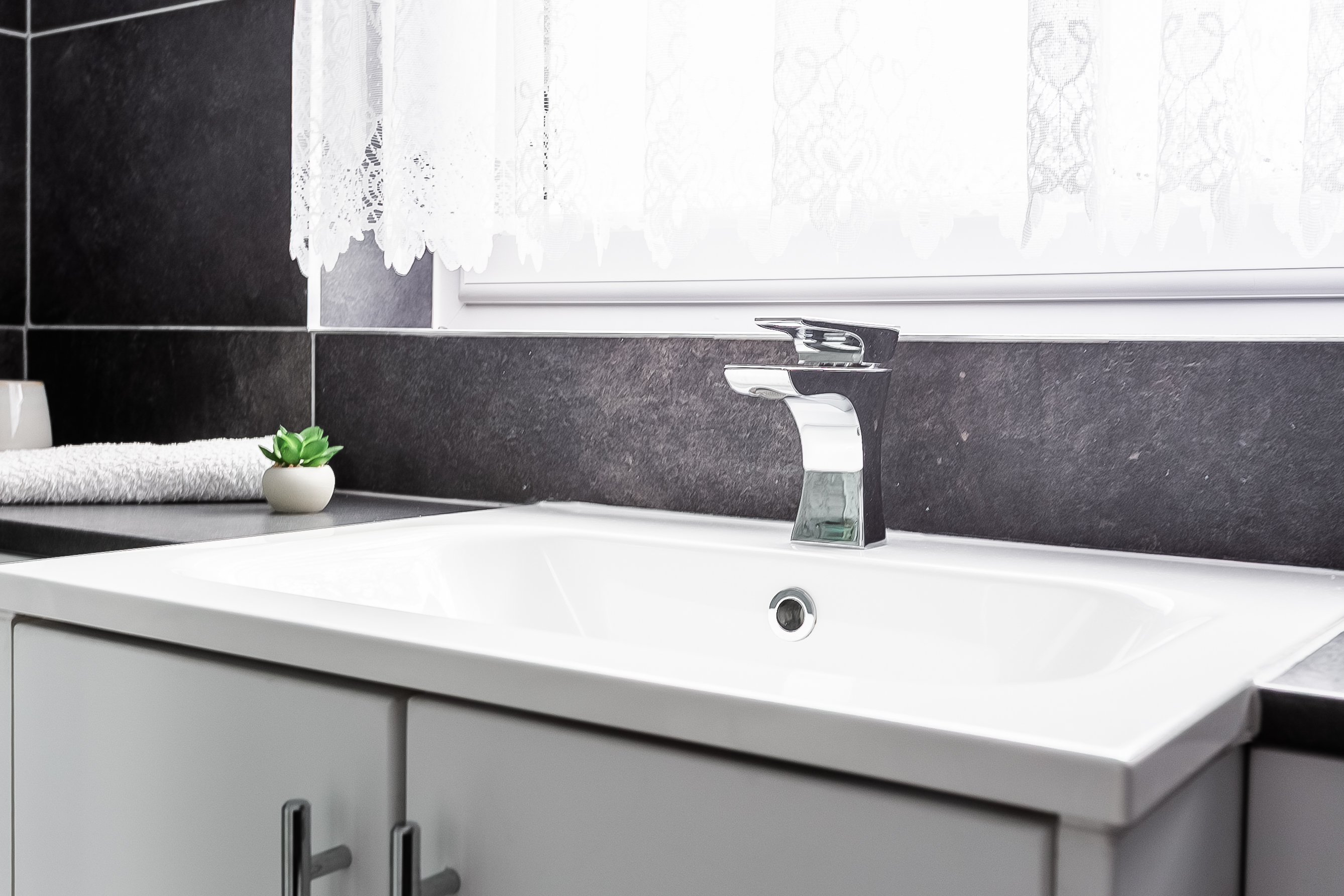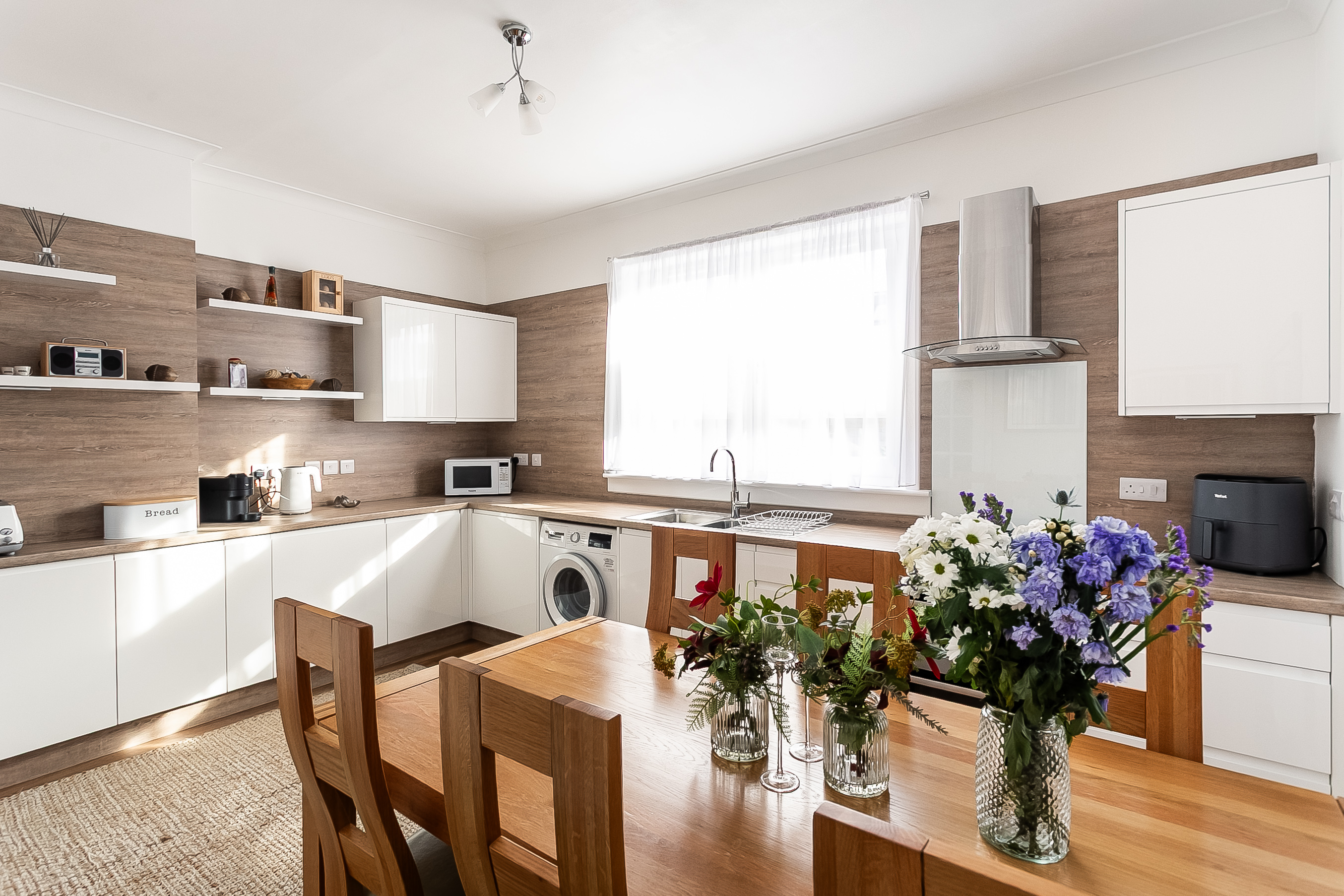 From the lounge, the generously proportioned dining kitchen benefits from a bright southerly aspect, bathing the space in natural light. Newly fitted modern units are complemented by wood-effect worktops and matching splashbacks, along with a sink and drainer.