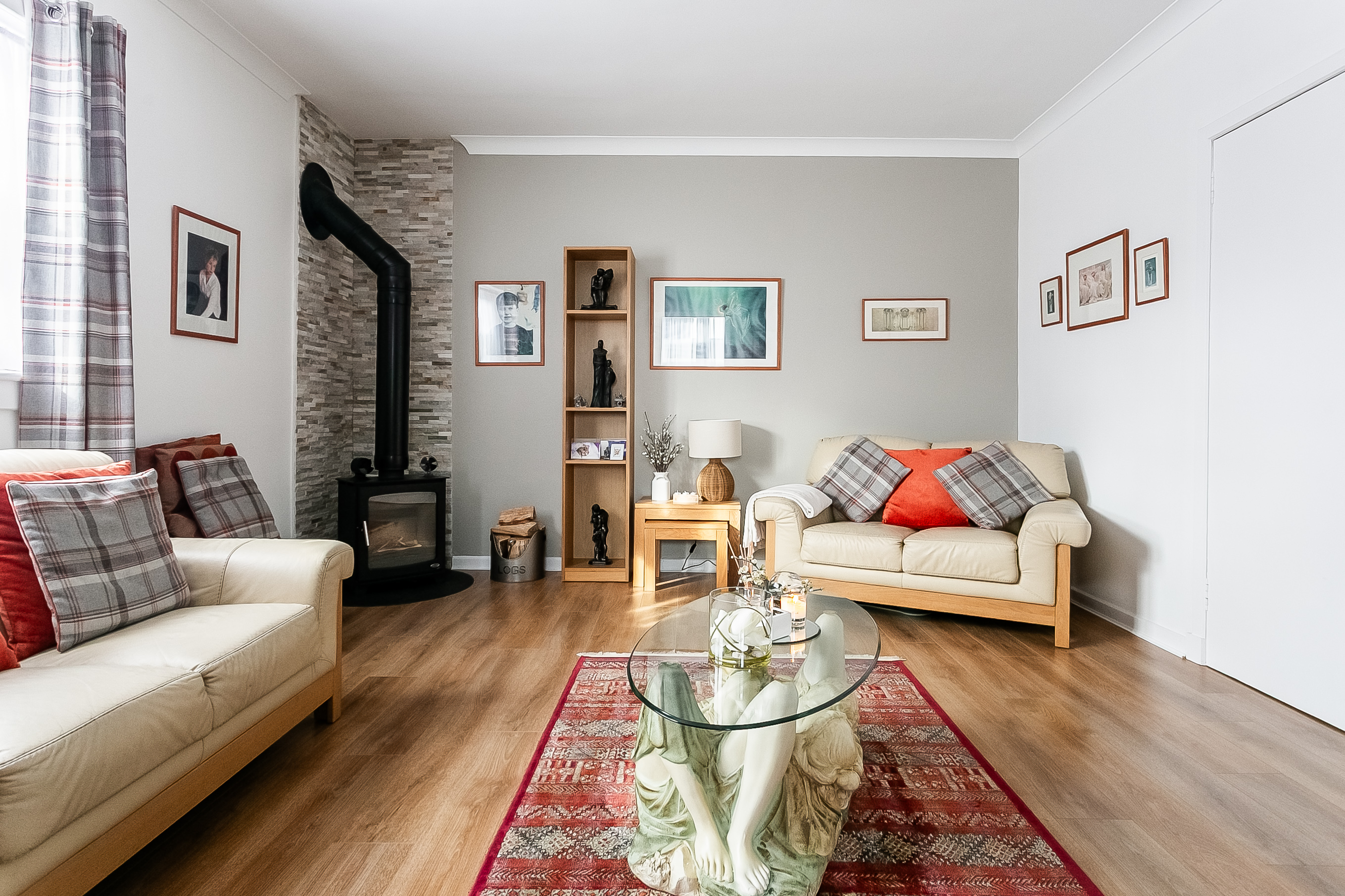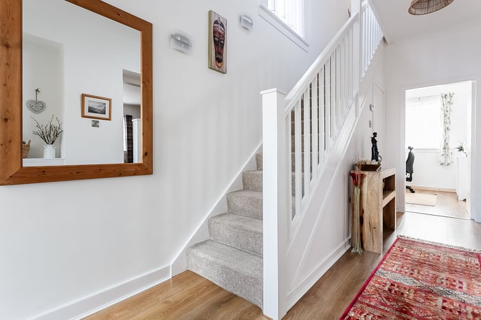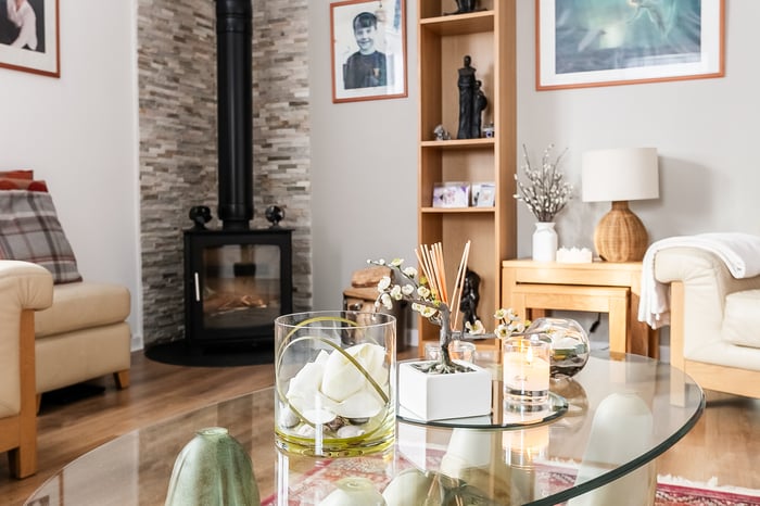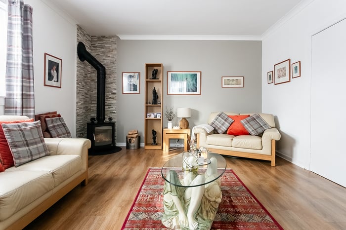 Beautifully presented and spacious, this exceptional three-bedroom semi-detached home, adjoining an impressive Victorian townhouse, benefits from a private driveway and well-maintained gardens. Set within the highly sought-after Newington area, south of Edinburgh’s city centre, the property enjoys a desirable address along with a triple-aspect and southerly-facing natural light. A welcoming entrance hall provides access to much of the ground floor and includes a useful understair storage cupboard, with stairs leading to the upper level. Positioned to the front, the stylish living room enjoys a side aspect, tasteful neutral decor, wood-effect flooring flowing seamlessly from the hall, and a charming wood-burning stove creating a warm focal point.
