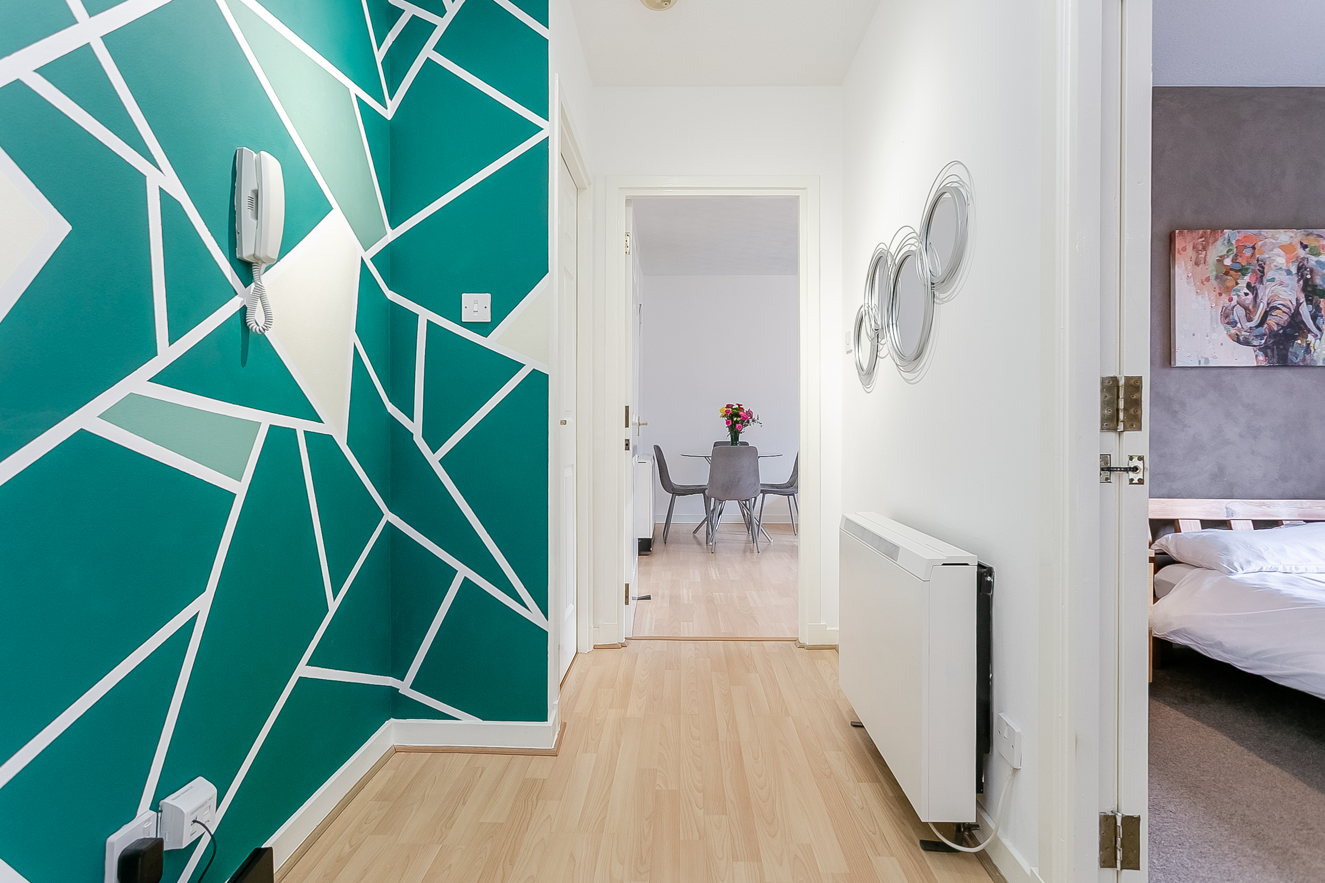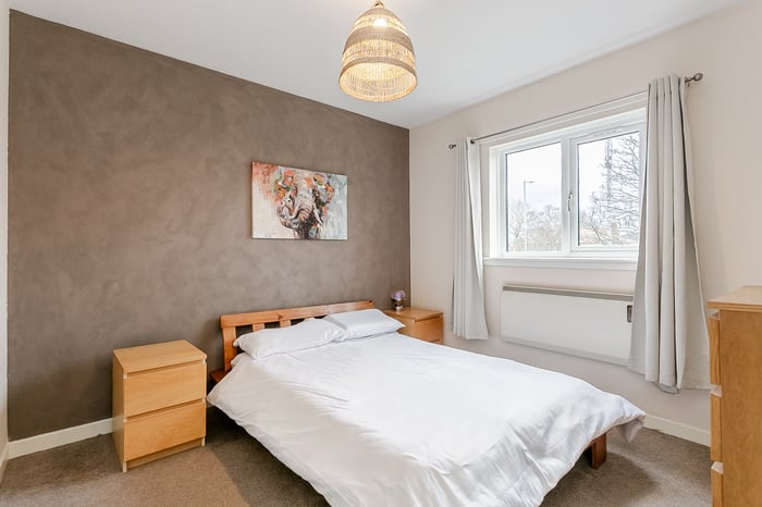 There is additional space for freestanding furniture if required. Completing the property, the fitted three-piece bathroom includes wood-effect flooring, a tiled splashback surround, a built-in storage cupboard and a shower over the bath.