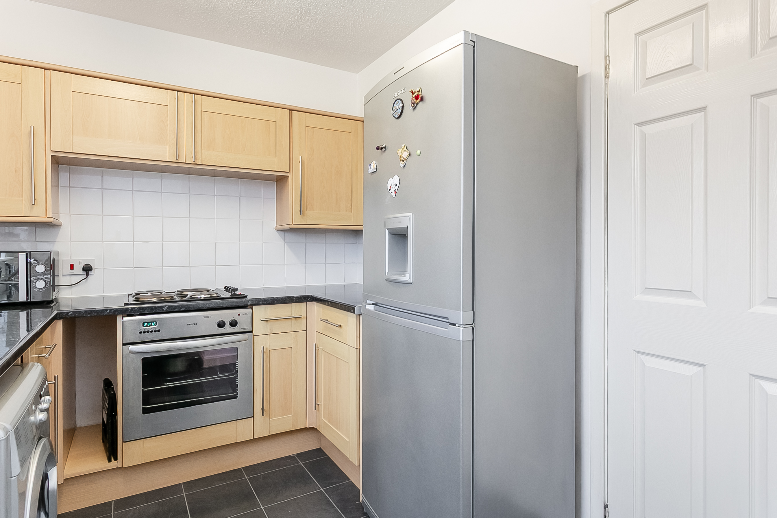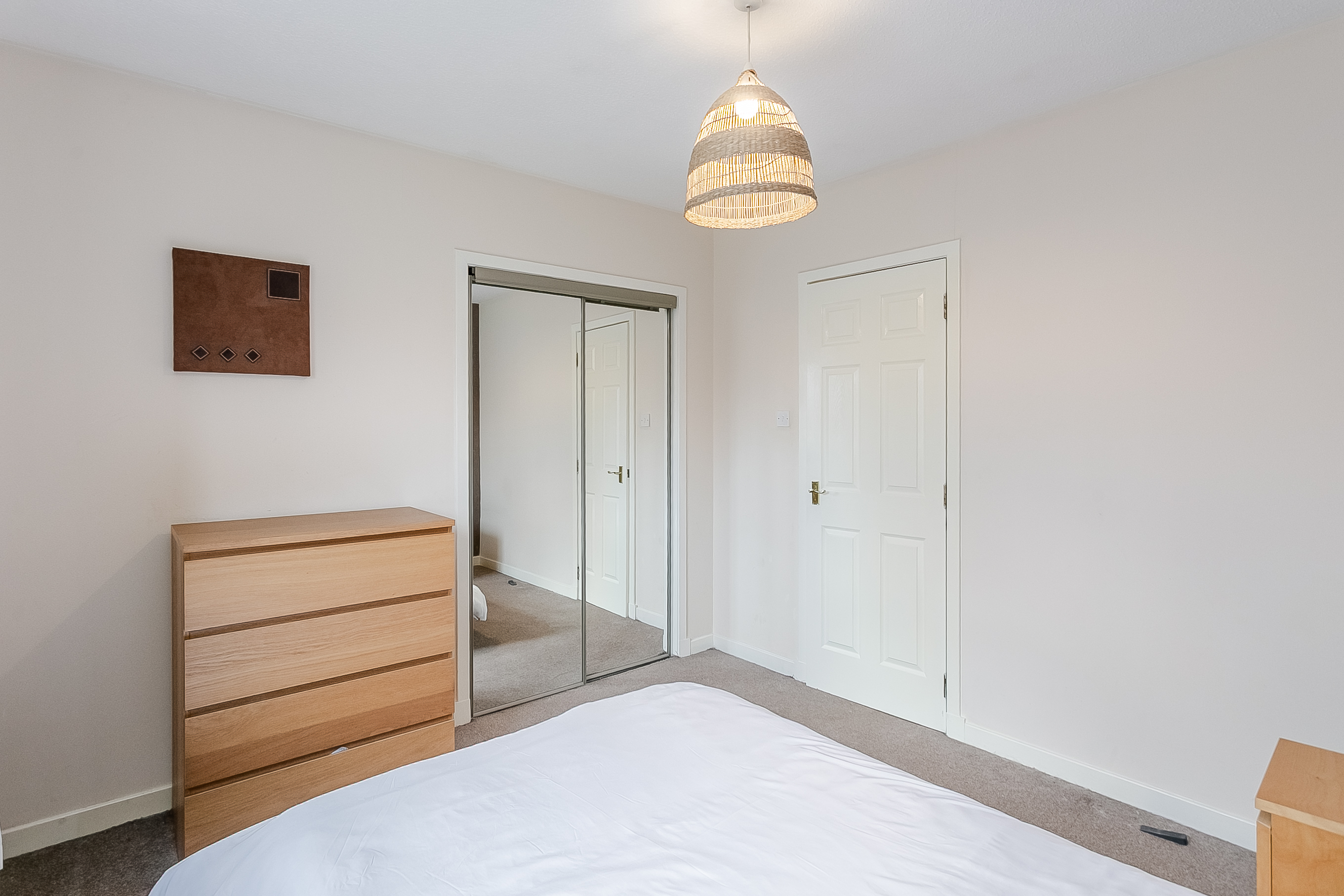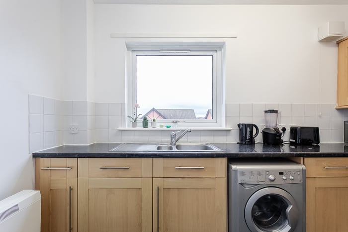 Appliances include a fridge freezer, washing machine, integrated oven and an electric hob with canopy above. Positioned to the front, the bedroom is a generous double with carpeted flooring, a central light fitting and a built-in wardrobe with mirrored sliding doors.