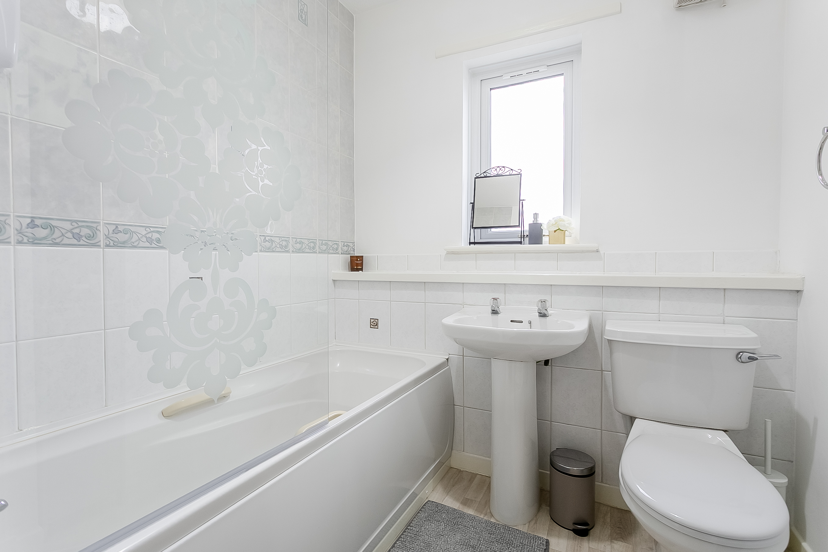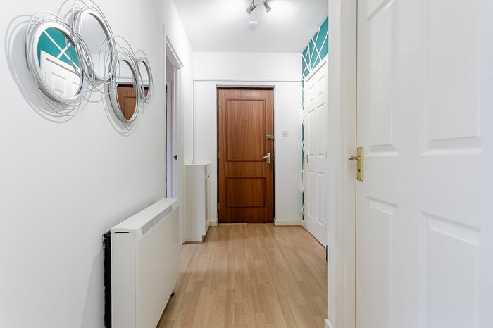 The entrance hall provides access to all rooms and includes a useful storage cupboard just inside the door. Set to the rear, the living and dining room is a bright and well-proportioned space with wood-effect flooring, a central light fitting and a large window allowing for plenty of natural light.