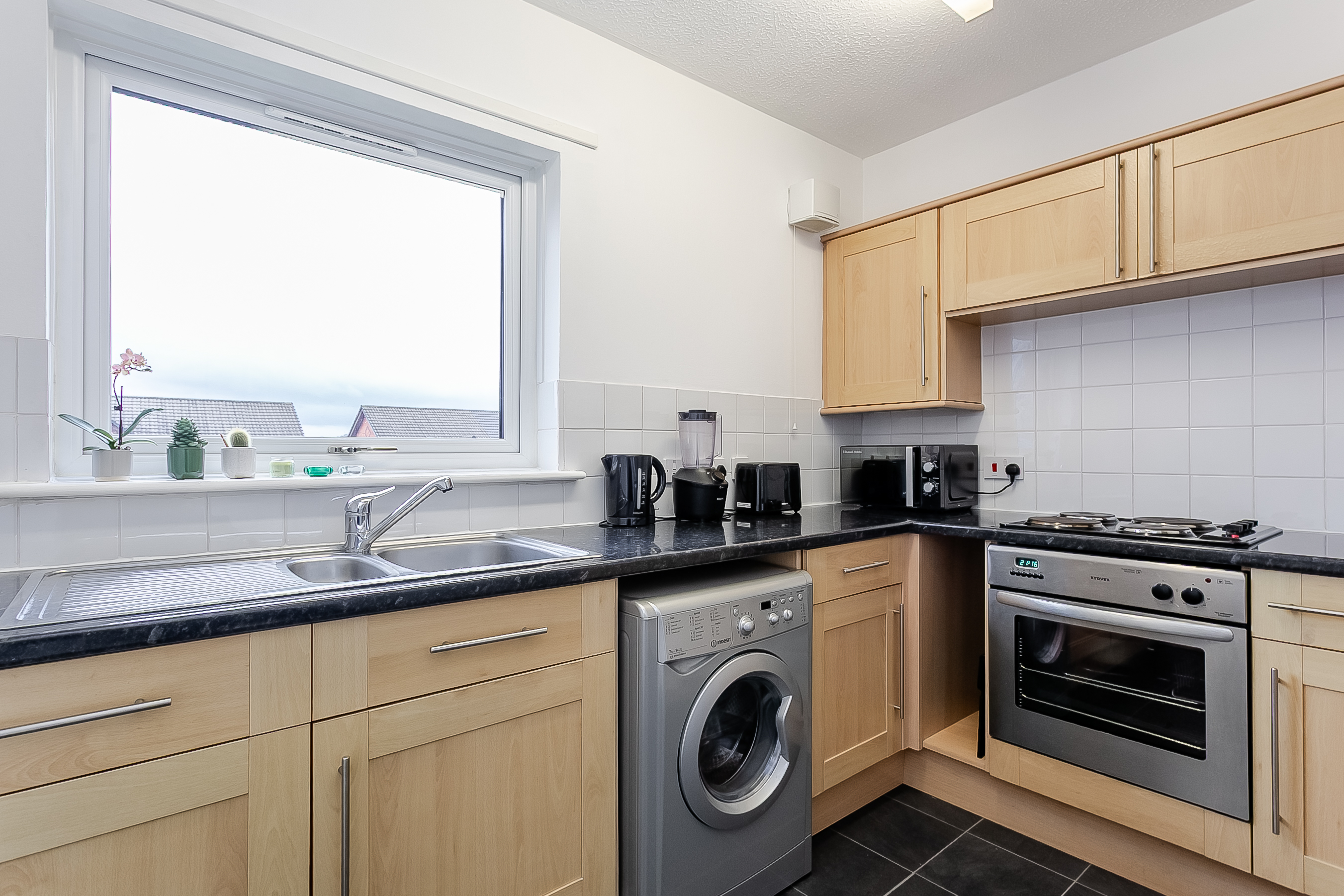 There is ample room for both lounge and dining furniture, making it ideal for relaxing or entertaining. Adjacent to the living area, the fitted kitchen features tiled effect flooring, stone effect worktops, a tiled splashback and a sink with a drainer.