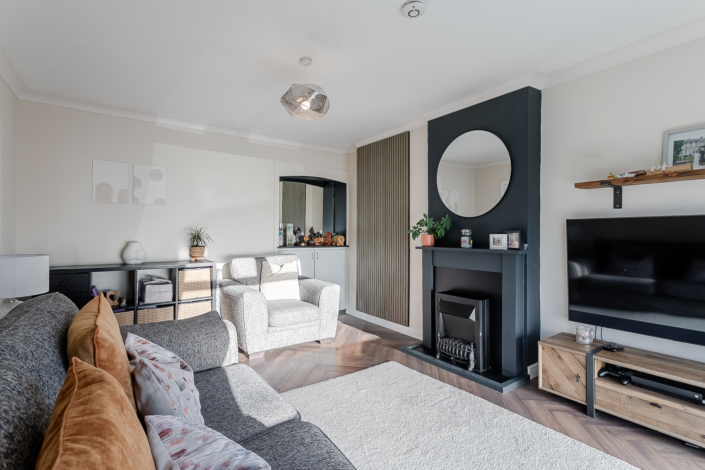 The welcoming entrance hall provides access throughout the ground floor and features generous understairs storage. Elegant herringbone-style flooring runs throughout, leading to a bright and spacious south-facing living room, enhanced by acoustic wall panels, a feature fireplace, a press with built-in storage, and a TV point — creating the perfect space to relax or entertain.
