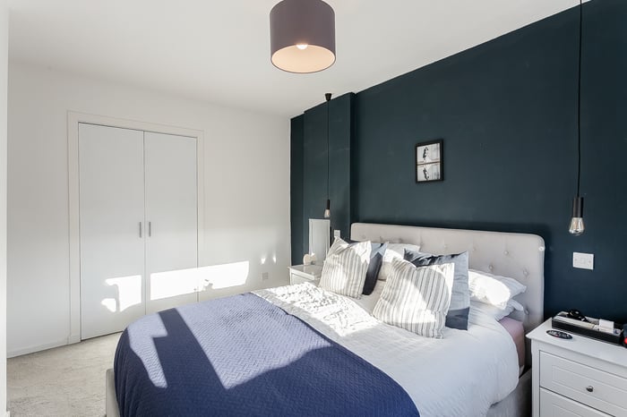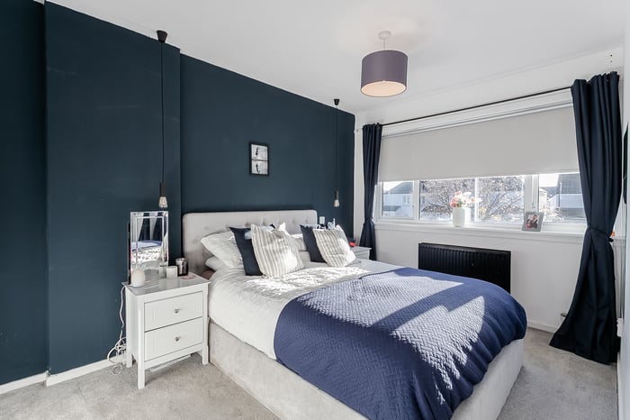 Patio doors open directly to the private rear garden, ideal for outdoor dining and family living. On the upper floor, bedroom one is set to the front, tastefully finished with carpeted flooring, a built-in wardrobe, and fitted bedside lights.