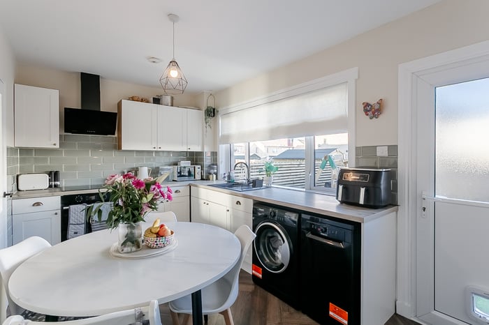 To the rear, the modern kitchen offers ample dining space, with contemporary fitted units, wood-effect worktops, a metro-tiled splashback, and integrated appliances including a hob and oven. A built-in cupboard houses the fridge/freezer, while a freestanding dishwasher and washing machine are also included.