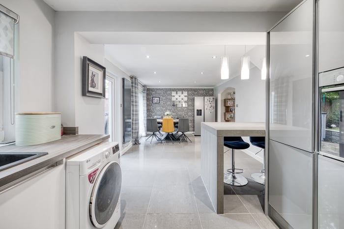 This space features tiled flooring, dark wood-effect countertops with matching upstands, a sink with drainer, an integrated oven and gas hob with canopy above, an integrated dishwasher, and a convenient breakfast bar, while also offering access to the private rear garden. To the front, bedroom four is located with wood-effect flooring, light décor, and an en-suite shower room complete with a shower cubicle.