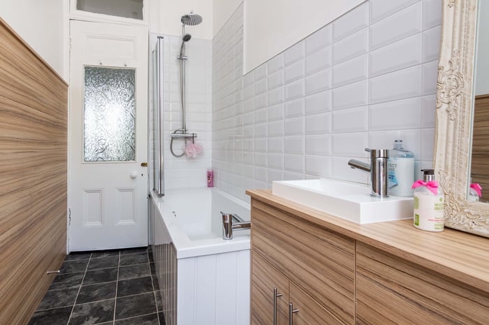 Completing the accommodation, the bathroom is fitted with a modern white three-piece suite with storage units, a mains mixer over-bath shower, tiled flooring and tiled splash walls.