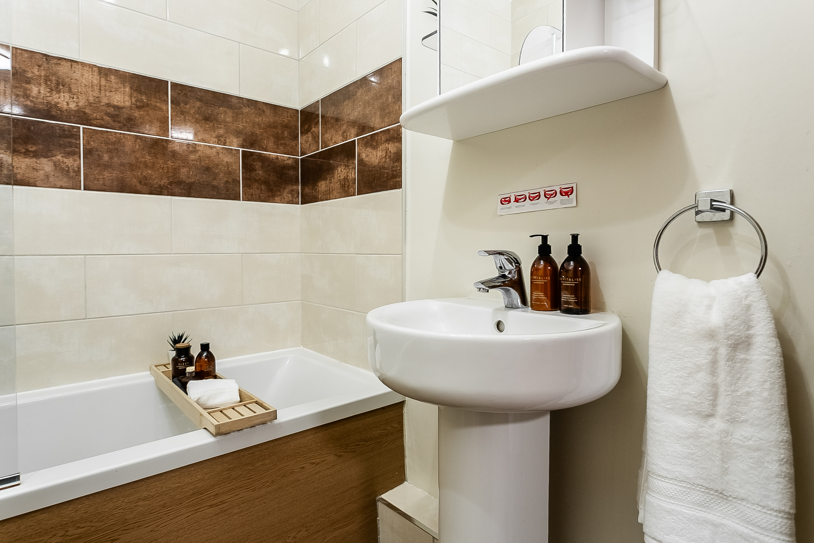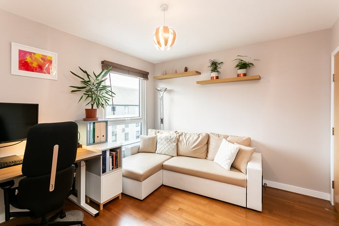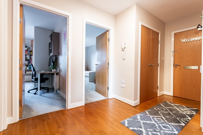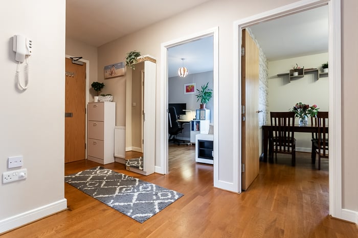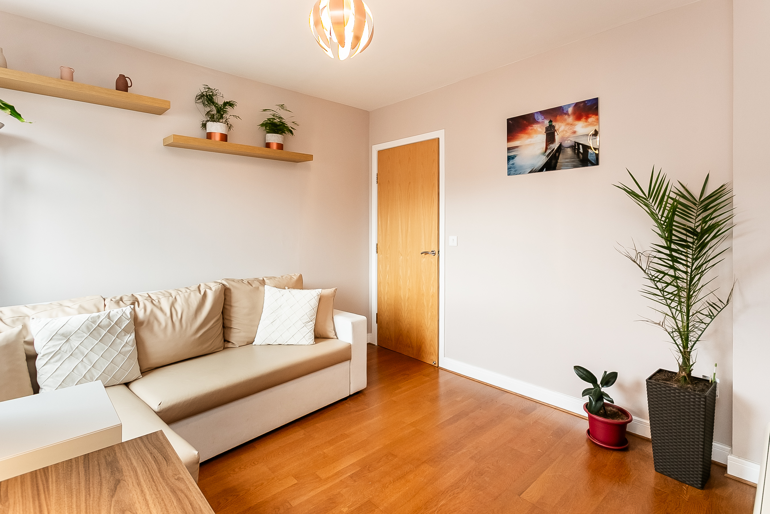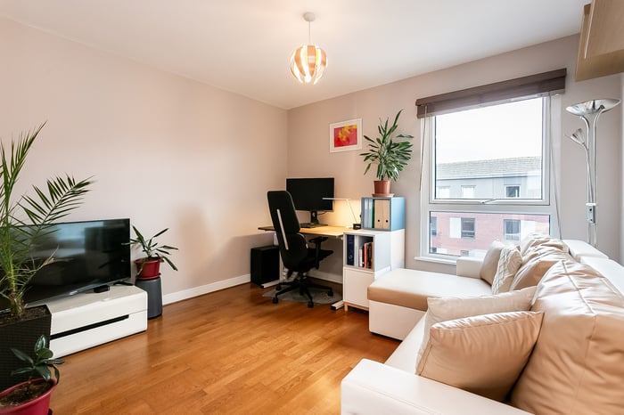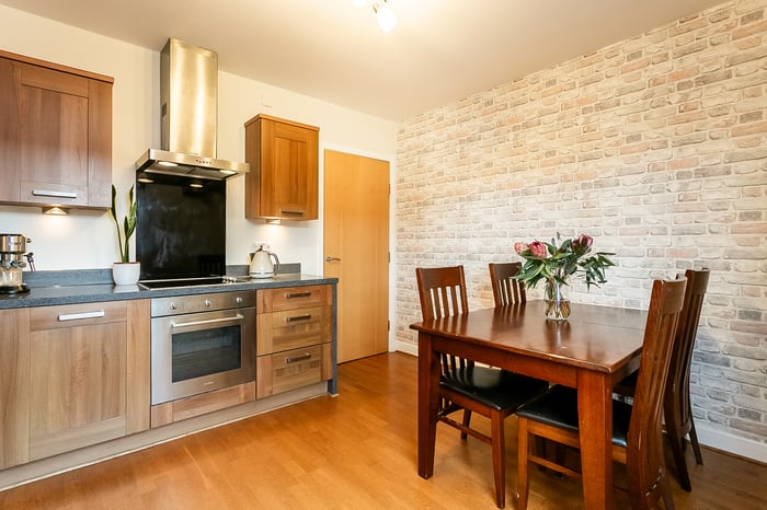 A further generously sized second bedroom, also finished with carpeted flooring, offers flexibility for use as a guest room, home office or nursery. Completing the property is a modern fitted three-piece bathroom featuring stylish wood-effect flooring, a tiled splashback surround, a central light fitting and a shower over the bath, finished to a contemporary standard.