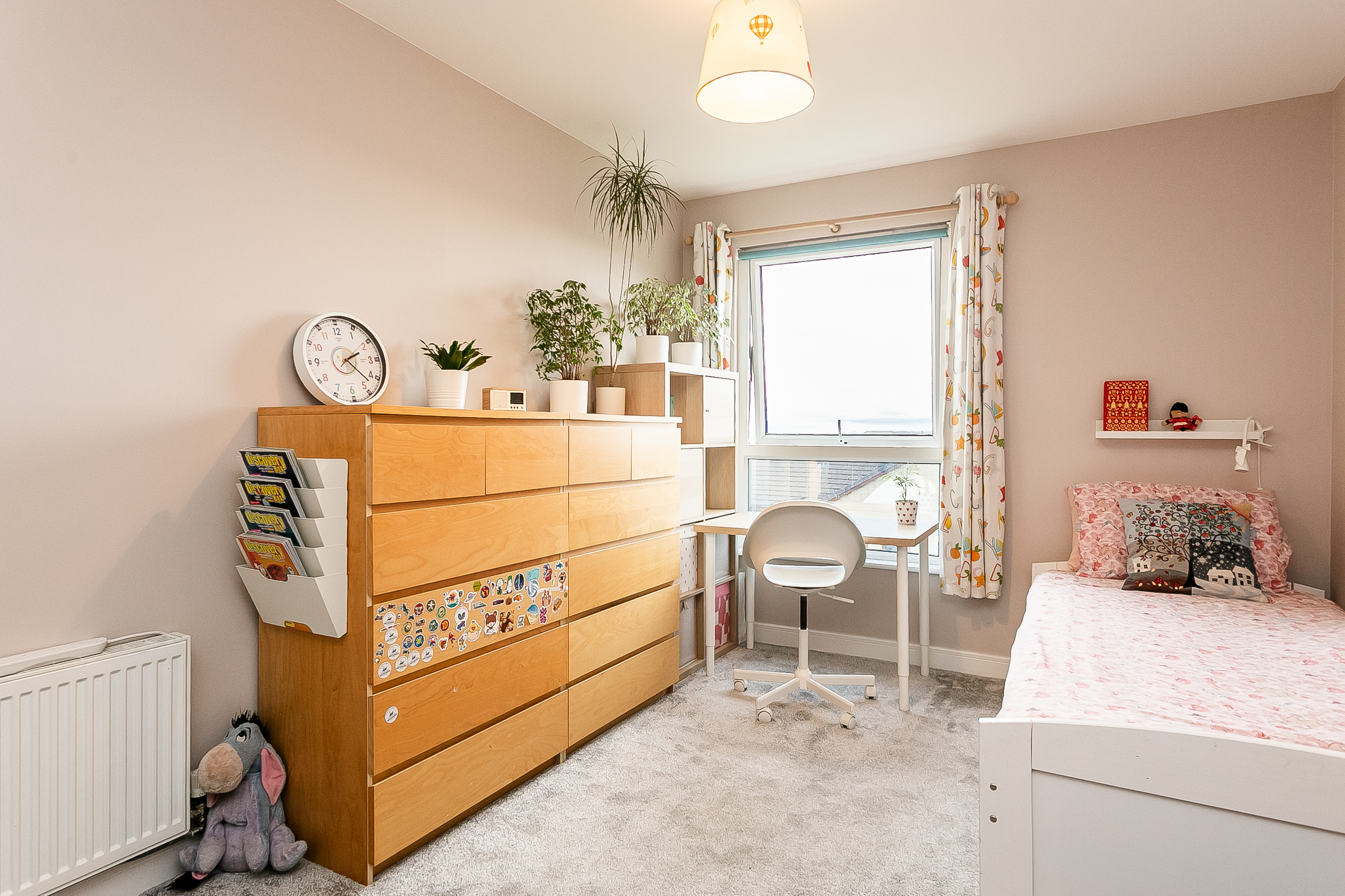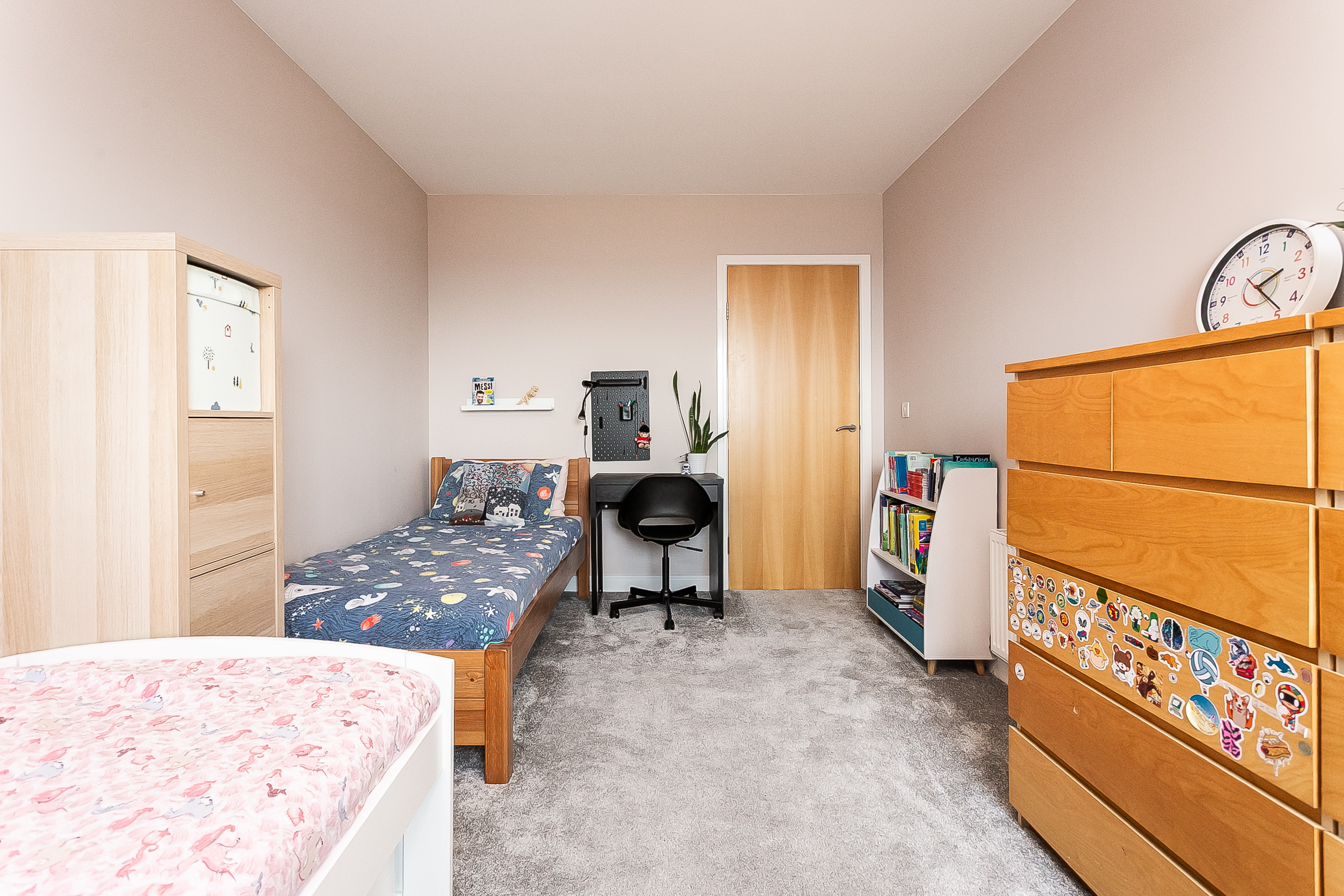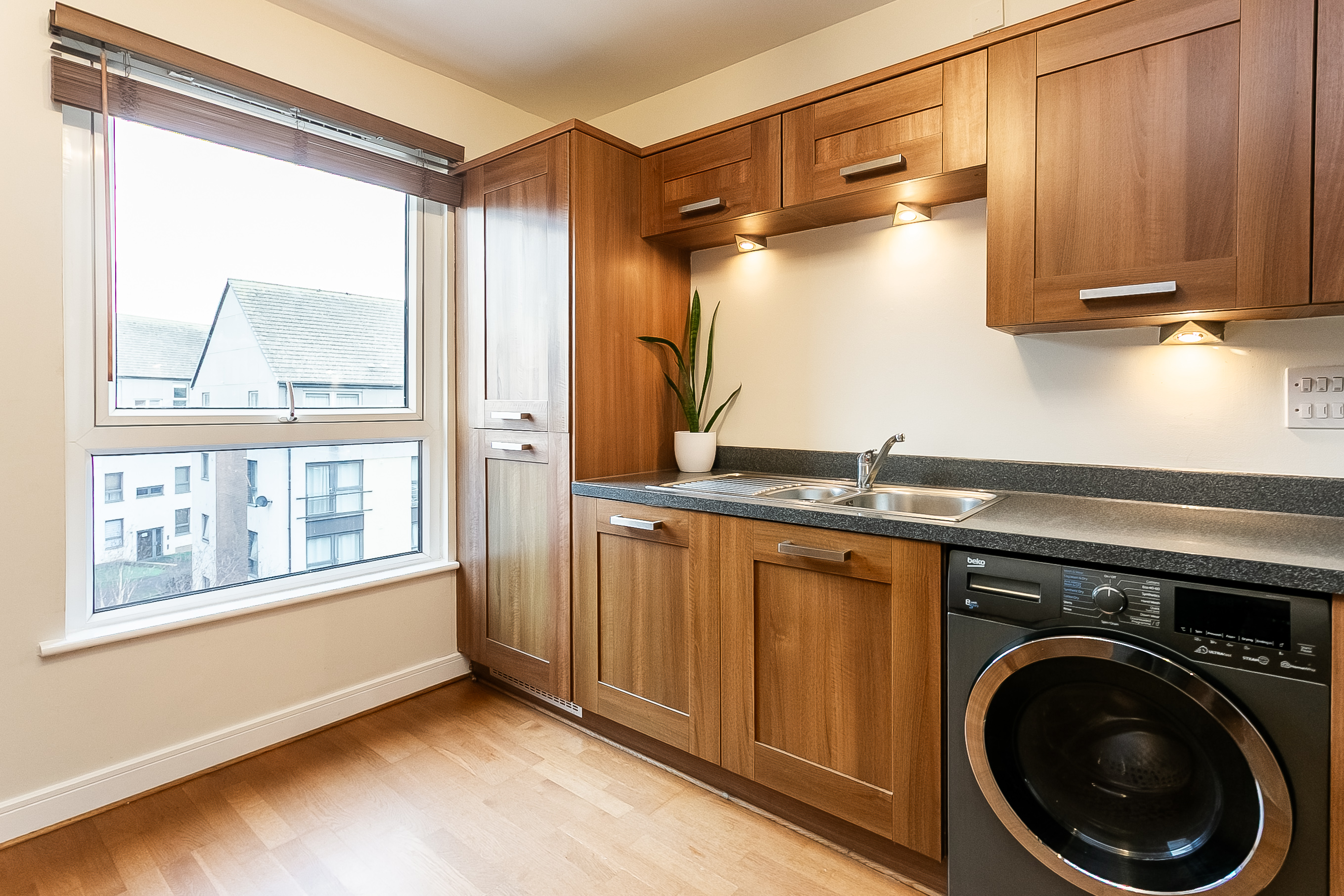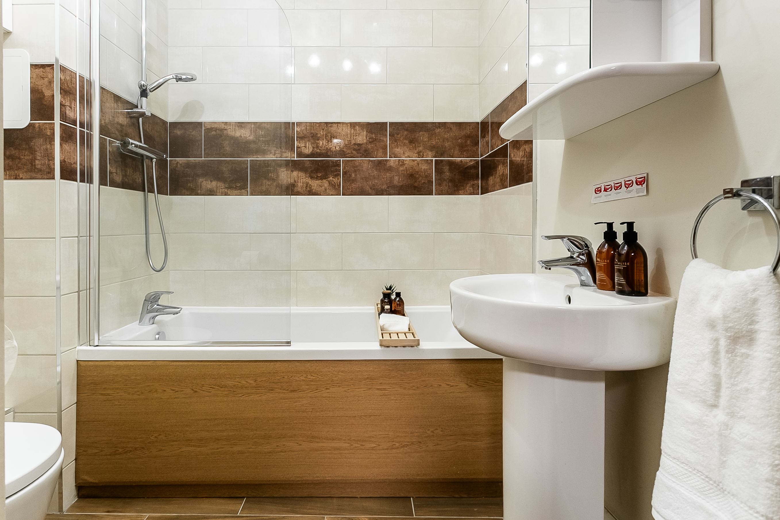 A further generously sized second bedroom, also finished with carpeted flooring, offers flexibility for use as a guest room, home office or nursery. Completing the property is a modern fitted three-piece bathroom featuring stylish wood-effect flooring, a tiled splashback surround, a central light fitting and a shower over the bath, finished to a contemporary standard.